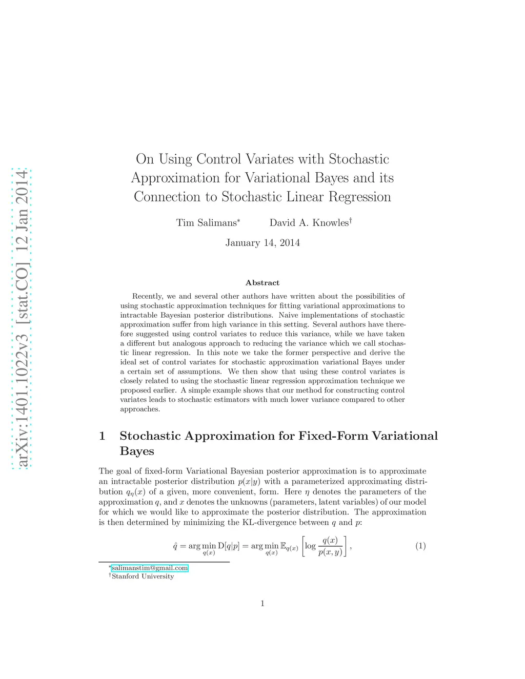 Recently, we and several other authors have written about the possibilities of using stochastic approximation techniques for fitting variational approximations to intractable Bayesian posterior distributions. Naive implementations of stochastic approximation suffer from high variance in this setting. Several authors have therefore suggested using control variates to reduce this variance, while we have taken a different but analogous approach to reducing the variance which we call stochastic linear regression. In this note we take the former perspective and derive the ideal set of control variates for stochastic approximation variational Bayes under a certain set of assumptions. We then show that using these control variates is closely related to using the stochastic linear regression approximation technique we proposed earlier. A simple example shows that our method for constructing control variates leads to stochastic estimators with much lower variance compared to other approaches.