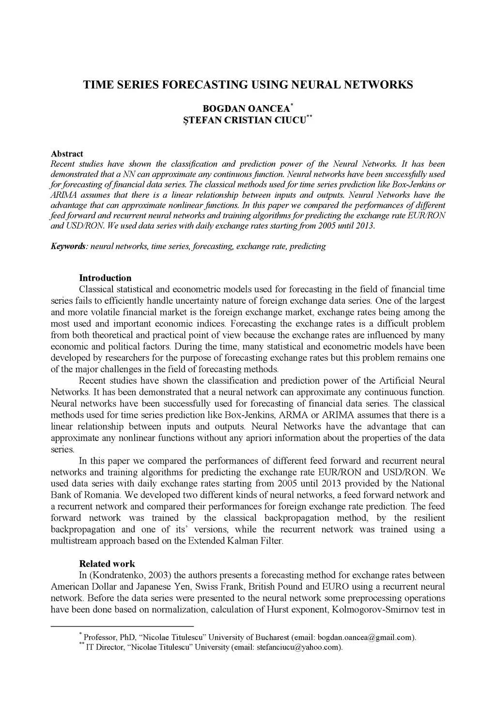 Recent studies have shown the classification and prediction power of the Neural Networks. It has been demonstrated that a NN can approximate any continuous function. Neural networks have been successfully used for forecasting of financial data series. The classical methods used for time series prediction like Box-Jenkins or ARIMA assumes that there is a linear relationship between inputs and outputs. Neural Networks have the advantage that can approximate nonlinear functions. In this paper we compared the performances of different feed forward and recurrent neural networks and training algorithms for predicting the exchange rate EUR/RON and USD/RON. We used data series with daily exchange rates starting from 2005 until 2013.
