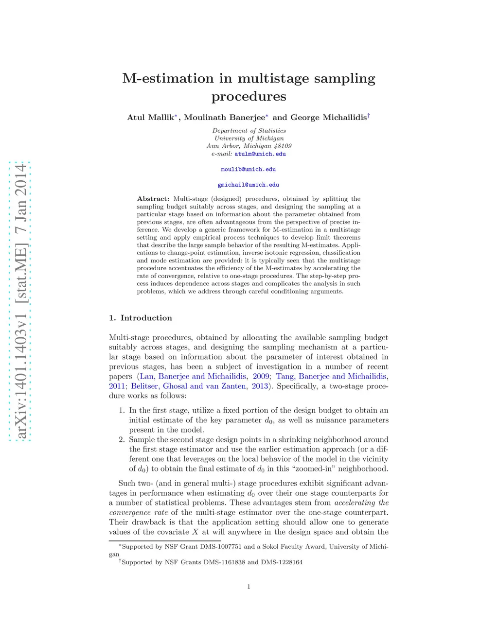 Multi-stage (designed) procedures, obtained by splitting the sampling budget suitably across stages, and designing the sampling at a particular stage based on information about the parameter obtained from previous stages, are often advantageous from the perspective of precise inference. We develop a generic framework for M-estimation in a multistage setting and apply empirical process techniques to develop limit theorems that describe the large sample behavior of the resulting M-estimates. Applications to change-point estimation, inverse isotonic regression, classification and mode estimation are provided: it is typically seen that the multistage procedure accentuates the efficiency of the M-estimates by accelerating the rate of convergence, relative to one-stage procedures. The step-by-step process induces dependence across stages and complicates the analysis in such problems, which we address through careful conditioning arguments.