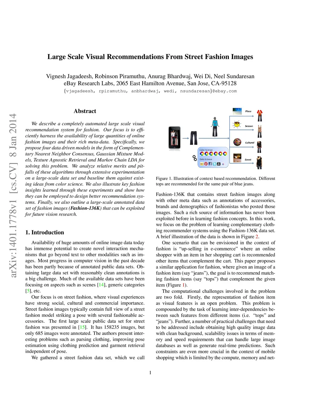 We describe a completely automated large scale visual recommendation system for fashion. Our focus is to efficiently harness the availability of large quantities of online fashion images and their rich meta-data. Specifically, we propose four data driven models in the form of Complementary Nearest Neighbor Consensus, Gaussian Mixture Models, Texture Agnostic Retrieval and Markov Chain LDA for solving this problem. We analyze relative merits and pitfalls of these algorithms through extensive experimentation on a large-scale data set and baseline them against existing ideas from color science. We also illustrate key fashion insights learned through these experiments and show how they can be employed to design better recommendation systems. Finally, we also outline a large-scale annotated data set of fashion images (Fashion-136K) that can be exploited for future vision research.