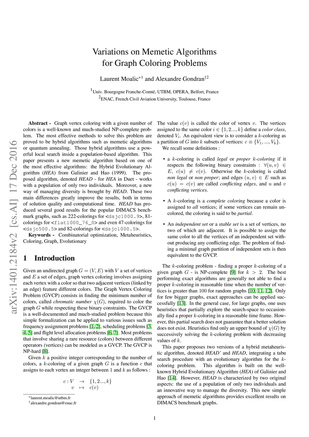 Graph vertex coloring with a given number of colors is a well-known and much-studied NP-complete problem.The most effective methods to solve this problem are proved to be hybrid algorithms such as memetic algorithms or quantum annealing. Those hybrid algorithms use a powerful local search inside a population-based algorithm.This paper presents a new memetic algorithm based on one of the most effective algorithms: the Hybrid Evolutionary Algorithm HEA from Galinier and Hao (1999).The proposed algorithm, denoted HEAD - for HEA in Duet - works with a population of only two individuals.Moreover, a new way of managing diversity is brought by HEAD.These two main differences greatly improve the results, both in terms of solution quality and computational time.HEAD has produced several good results for the popular DIMACS benchmark graphs, such as 222-colorings for \textless{}dsjc1000.9\textgreater{}, 81-colorings for \textless{}flat1000\_76\_0\textgreater{} and even 47-colorings for \textless{}dsjc500.5\textgreater{} and 82-colorings for \textless{}dsjc1000.5\textgreater{}.