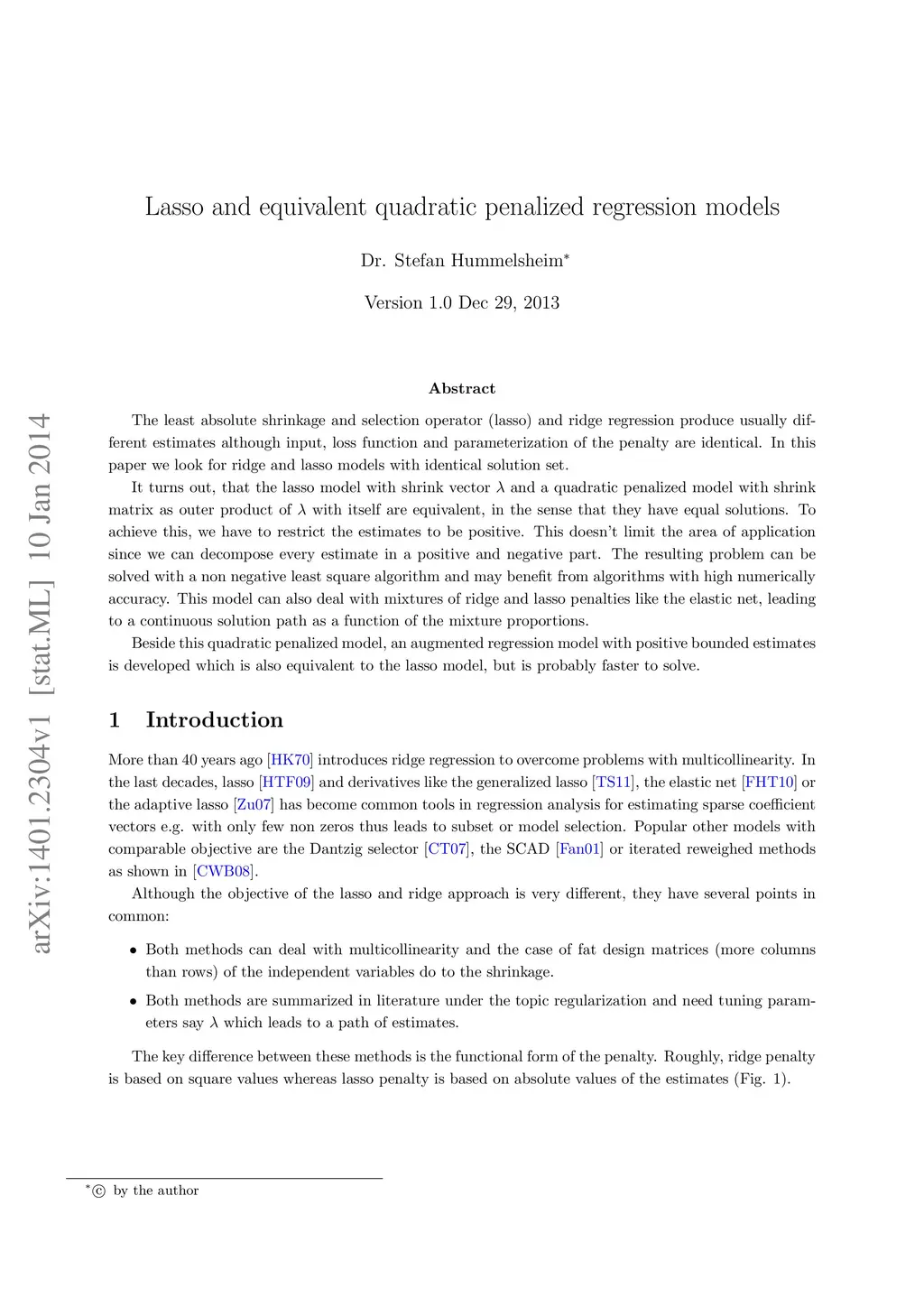The least absolute shrinkage and selection operator (lasso) and ridge regression produce usually different estimates although input, loss function and parameterization of the penalty are identical. In this paper we look for ridge and lasso models with identical solution set. It turns out, that the lasso model with shrink vector and a quadratic penalized model with shrink matrix as outer product of with itself are equivalent, in the sense that they have equal solutions. To achieve this, we have to restrict the estimates to be positive. This doesn't limit the area of application since we can easily decompose every estimate in a positive and negative part. The resulting problem can be solved with a non negative least square algorithm. Beside this quadratic penalized model, an augmented regression model with positive bounded estimates is developed which is also equivalent to the lasso model, but is probably faster to solve.
