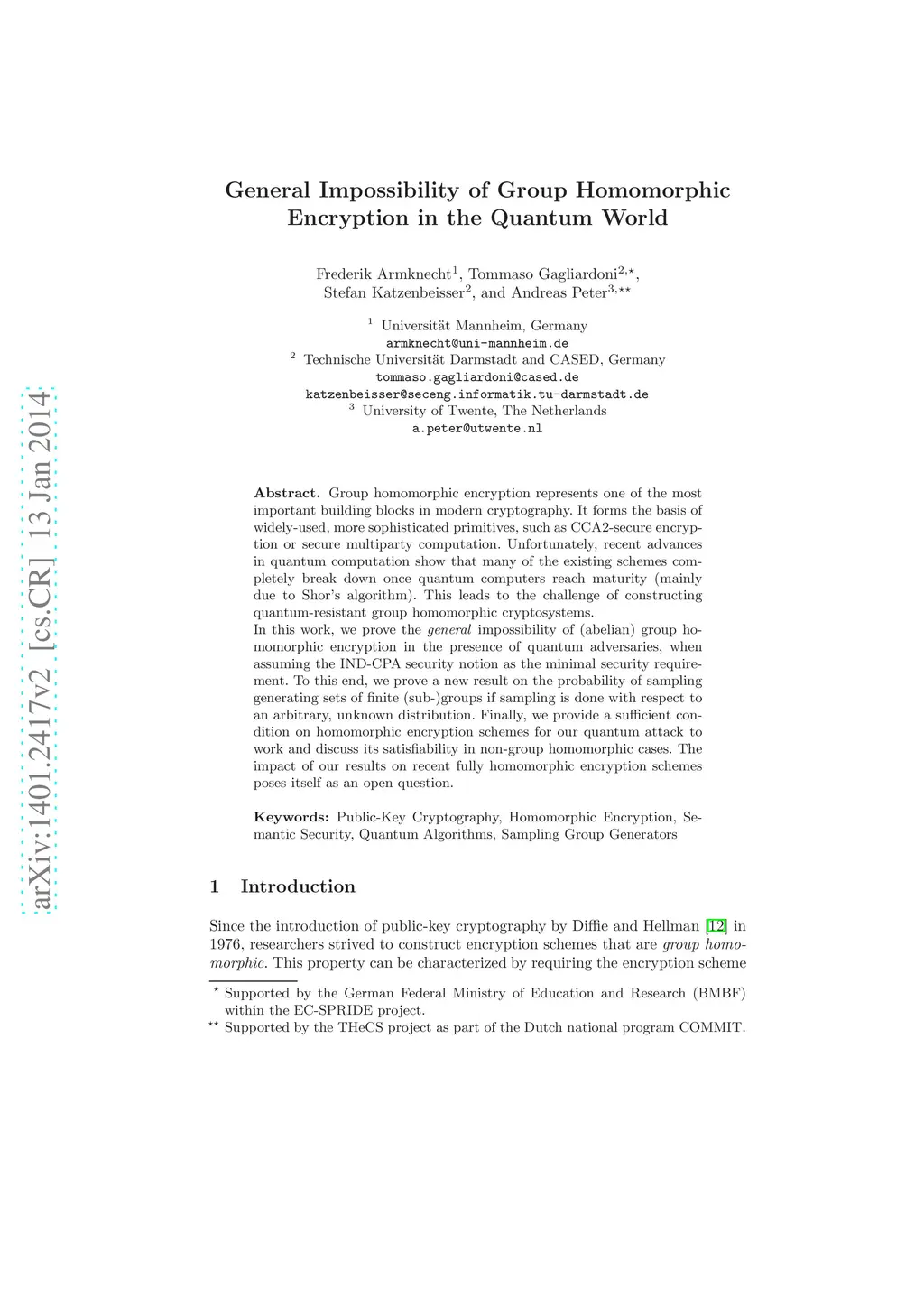 Group homomorphic encryption represents one of the most important building blocks in modern cryptography. It forms the basis of widely-used, more sophisticated primitives, such as CCA2-secure encryption or secure multiparty computation. Unfortunately, recent advances in quantum computation show that many of the existing schemes completely break down once quantum computers reach maturity (mainly due to Shor's algorithm). This leads to the challenge of constructing quantum-resistant group homomorphic cryptosystems. In this work, we prove the general impossibility of (abelian) group homomorphic encryption in the presence of quantum adversaries, when assuming the IND-CPA security notion as the minimal security requirement. To this end, we prove a new result on the probability of sampling generating sets of finite (sub-)groups if sampling is done with respect to an arbitrary, unknown distribution. Finally, we provide a sufficient condition on homomorphic encryption schemes for our quantum attack to work and discuss its satisfiability in non-group homomorphic cases. The impact of our results on recent fully homomorphic encryption schemes poses itself as an open question.