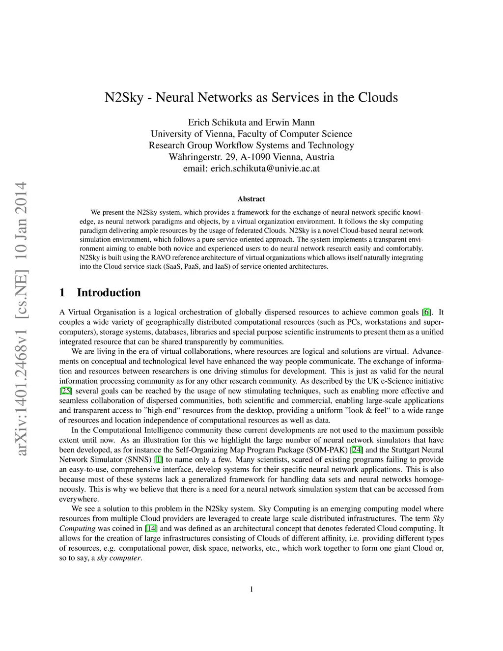We present the N2Sky system, which provides a framework for the exchange of neural network specific knowledge, as neural network paradigms and objects, by a virtual organization environment. It follows the sky computing paradigm delivering ample resources by the usage of federated Clouds. N2Sky is a novel Cloud-based neural network simulation environment, which follows a pure service oriented approach. The system implements a transparent environment aiming to enable both novice and experienced users to do neural network research easily and comfortably. N2Sky is built using the RAVO reference architecture of virtual organizations which allows itself naturally integrating into the Cloud service stack (SaaS, PaaS, and IaaS) of service oriented architectures.