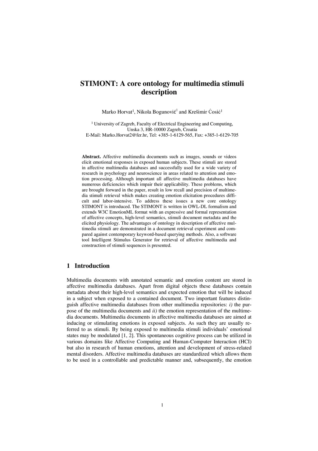 Affective multimedia documents such as images, sounds or videos elicit emotional responses in exposed human subjects. These stimuli are stored in affective multimedia databases and successfully used for a wide variety of research in psychology and neuroscience in areas related to attention and emotion processing. Although important all affective multimedia databases have numerous deficiencies which impair their applicability. These problems, which are brought forward in the paper, result in low recall and precision of multimedia stimuli retrieval which makes creating emotion elicitation procedures difficult and labor-intensive. To address these issues a new core ontology STIMONT is introduced. The STIMONT is written in OWL-DL formalism and extends W3C EmotionML format with an expressive and formal representation of affective concepts, high-level semantics, stimuli document metadata and the elicited physiology. The advantages of ontology in description of affective multimedia stimuli are demonstrated in a document retrieval experiment and compared against contemporary keyword-based querying methods. Also, a software tool Intelligent Stimulus Generator for retrieval of affective multimedia and construction of stimuli sequences is presented.
