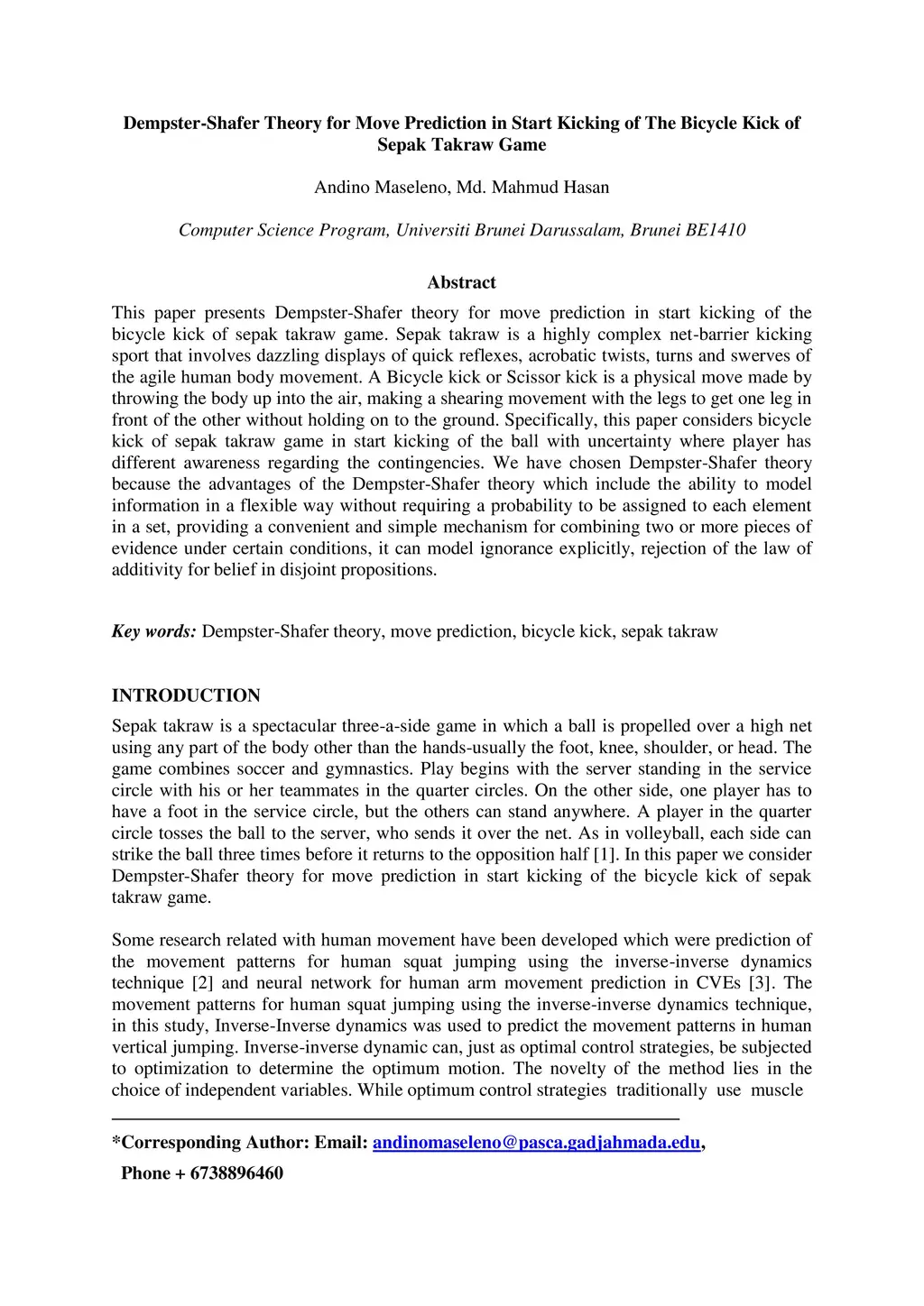 This paper presents Dempster-Shafer theory for move prediction in start kicking of the bicycle kick of sepak takraw game. Sepak takraw is a highly complex net-barrier kicking sport that involves dazzling displays of quick reflexes, acrobatic twists, turns and swerves of the agile human body movement. A Bicycle kick or Scissor kick is a physical move made by throwing the body up into the air, making a shearing movement with the legs to get one leg in front of the other without holding on to the ground. Specifically, this paper considers bicycle kick of sepak takraw game in start kicking of the ball with uncertainty where player has different awareness regarding the contingencies. We have chosen Dempster-Shafer theory because the advantages of the Dempster-Shafer theory which include the ability to model information in a flexible way without requiring a probability to be assigned to each element in a set, providing a convenient and simple mechanism for combining two or more pieces of evidence under certain conditions, it can model ignorance explicitly, rejection of the law of additivity for belief in disjoint propositions.