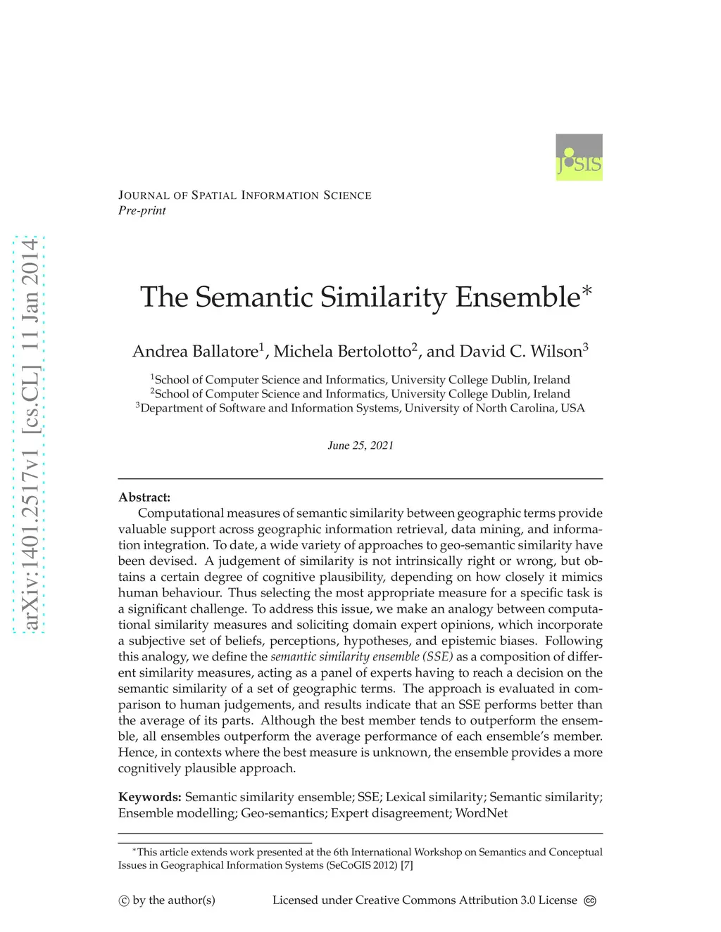 Computational measures of semantic similarity between geographic terms provide valuable support across geographic information retrieval, data mining, and information integration. To date, a wide variety of approaches to geo-semantic similarity have been devised. A judgment of similarity is not intrinsically right or wrong, but obtains a certain degree of cognitive plausibility, depending on how closely it mimics human behavior. Thus selecting the most appropriate measure for a specific task is a significant challenge. To address this issue, we make an analogy between computational similarity measures and soliciting domain expert opinions, which incorporate a subjective set of beliefs, perceptions, hypotheses, and epistemic biases. Following this analogy, we define the semantic similarity ensemble (SSE) as a composition of different similarity measures, acting as a panel of experts having to reach a decision on the semantic similarity of a set of geographic terms. The approach is evaluated in comparison to human judgments, and results indicate that an SSE performs better than the average of its parts. Although the best member tends to outperform the ensemble, all ensembles outperform the average performance of each ensemble's member. Hence, in contexts where the best measure is unknown, the ensemble provides a more cognitively plausible approach.