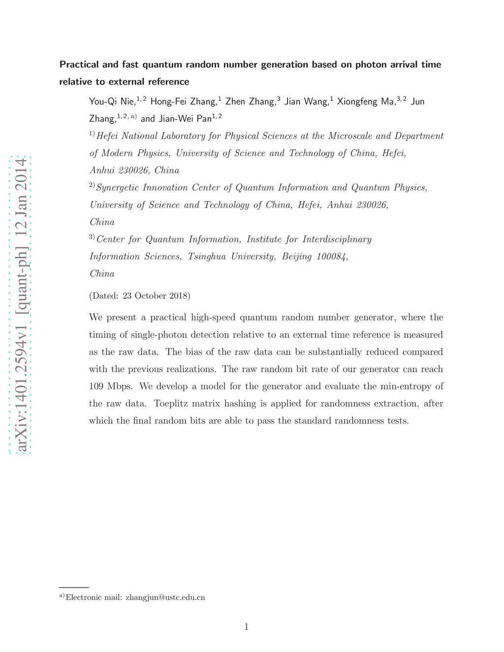 We present a practical high-speed quantum random number generator, where the timing of single-photon detection relative to an external time reference is measured as the raw data. The bias of the raw data can be substantially reduced compared with the previous realizations. The raw random bit rate of our generator can reach 109 Mbps. We develop a model for the generator and evaluate the min-entropy of the raw data. Toeplitz matrix hashing is applied for randomness extraction, after which the final random bits are able to pass the standard randomness tests.