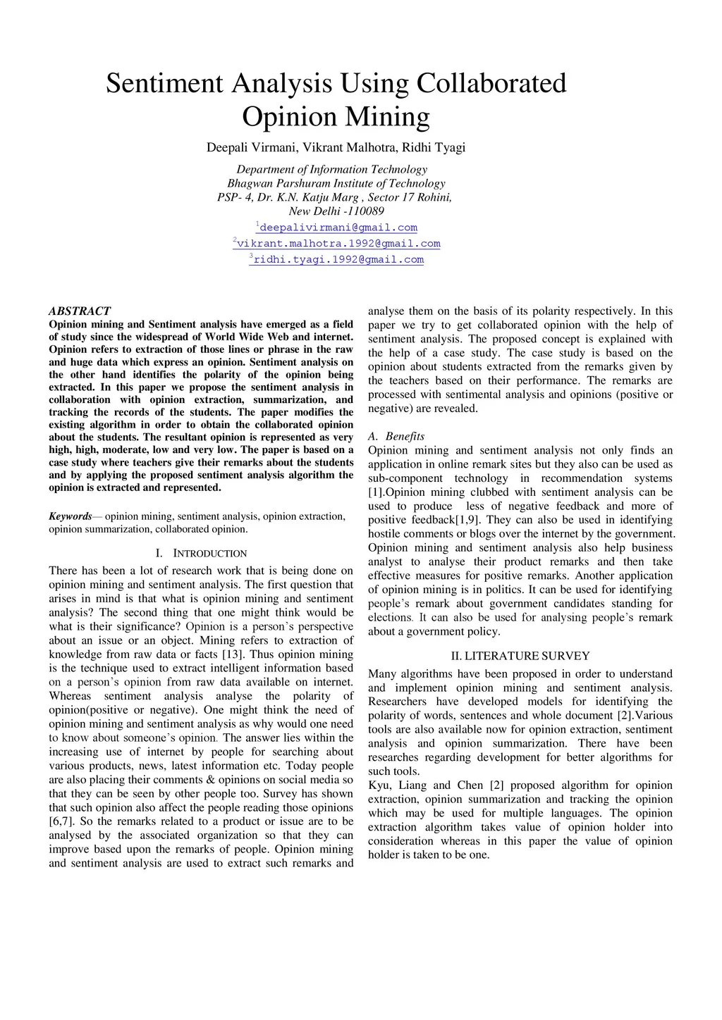 Opinion mining and Sentiment analysis have emerged as a field of study since the widespread of World Wide Web and internet. Opinion refers to extraction of those lines or phrase in the raw and huge data which express an opinion. Sentiment analysis on the other hand identifies the polarity of the opinion being extracted. In this paper we propose the sentiment analysis in collaboration with opinion extraction, summarization, and tracking the records of the students. The paper modifies the existing algorithm in order to obtain the collaborated opinion about the students. The resultant opinion is represented as very high, high, moderate, low and very low. The paper is based on a case study where teachers give their remarks about the students and by applying the proposed sentiment analysis algorithm the opinion is extracted and represented.