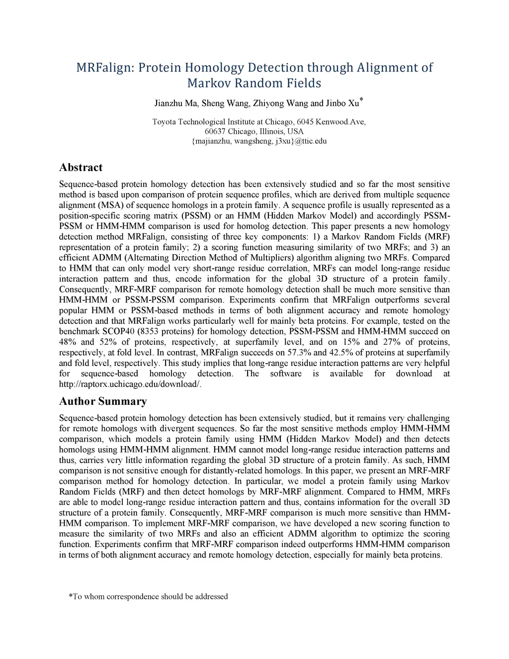 MRFalign: Protein Homology Detection through Alignment of Markov Random
