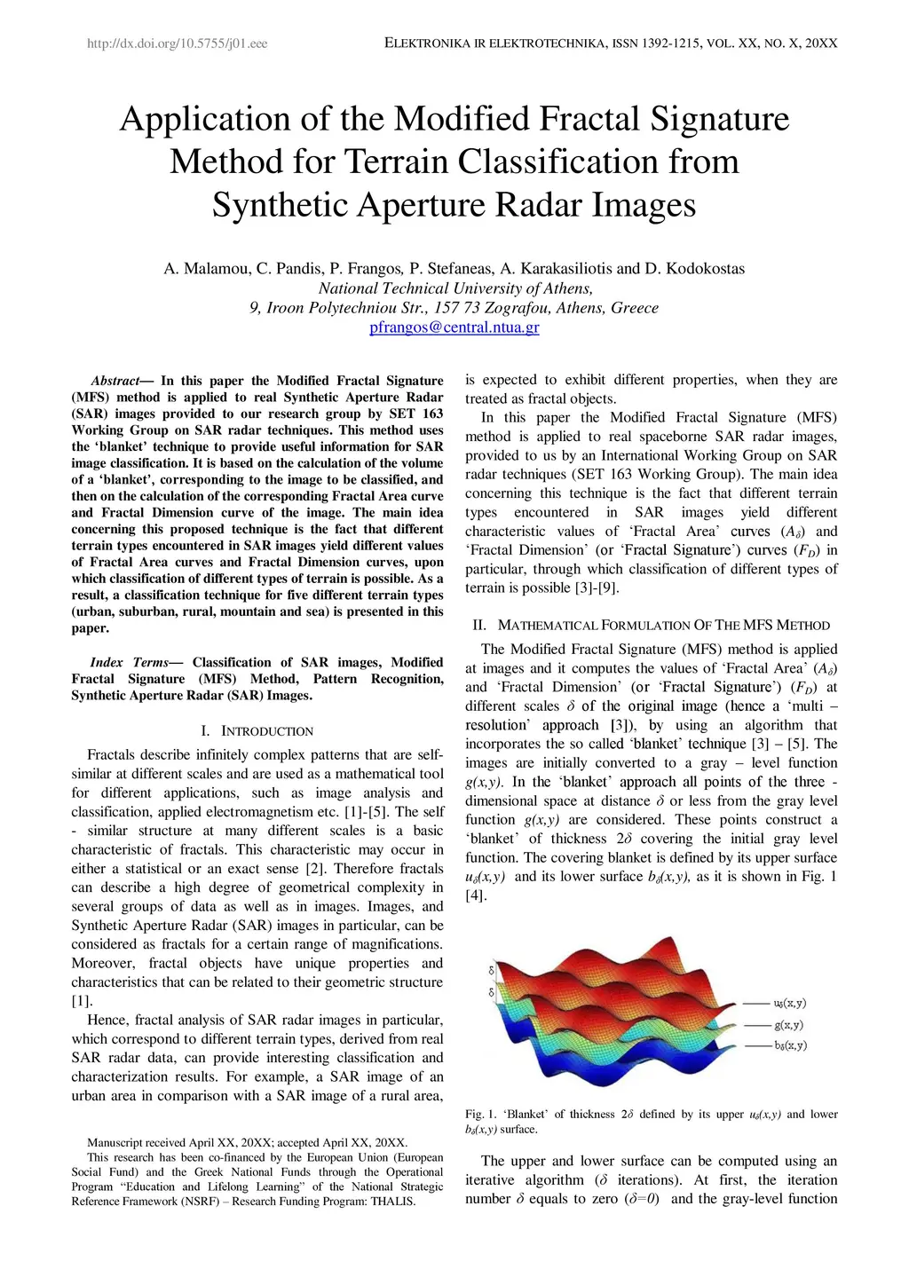In this paper the Modified Fractal Signature method is applied to real Synthetic Aperture Radar images provided to our research group by SET 163 Working Group on SAR radar techniques. This method uses the blanket technique to provide useful information for SAR image classification. It is based on the calculation of the volume of a blanket, corresponding to the image to be classified, and then on the calculation of the corresponding Fractal Area curve and Fractal Dimension curve of the image. The main idea concerning this proposed technique is the fact that different terrain types encountered in SAR images yield different values of Fractal Area curves and Fractal Dimension curves, upon which classification of different types of terrain is possible. As a result, a classification technique for five different terrain types, i.e. urban, suburban, rural, mountain and sea, is presented in this paper.