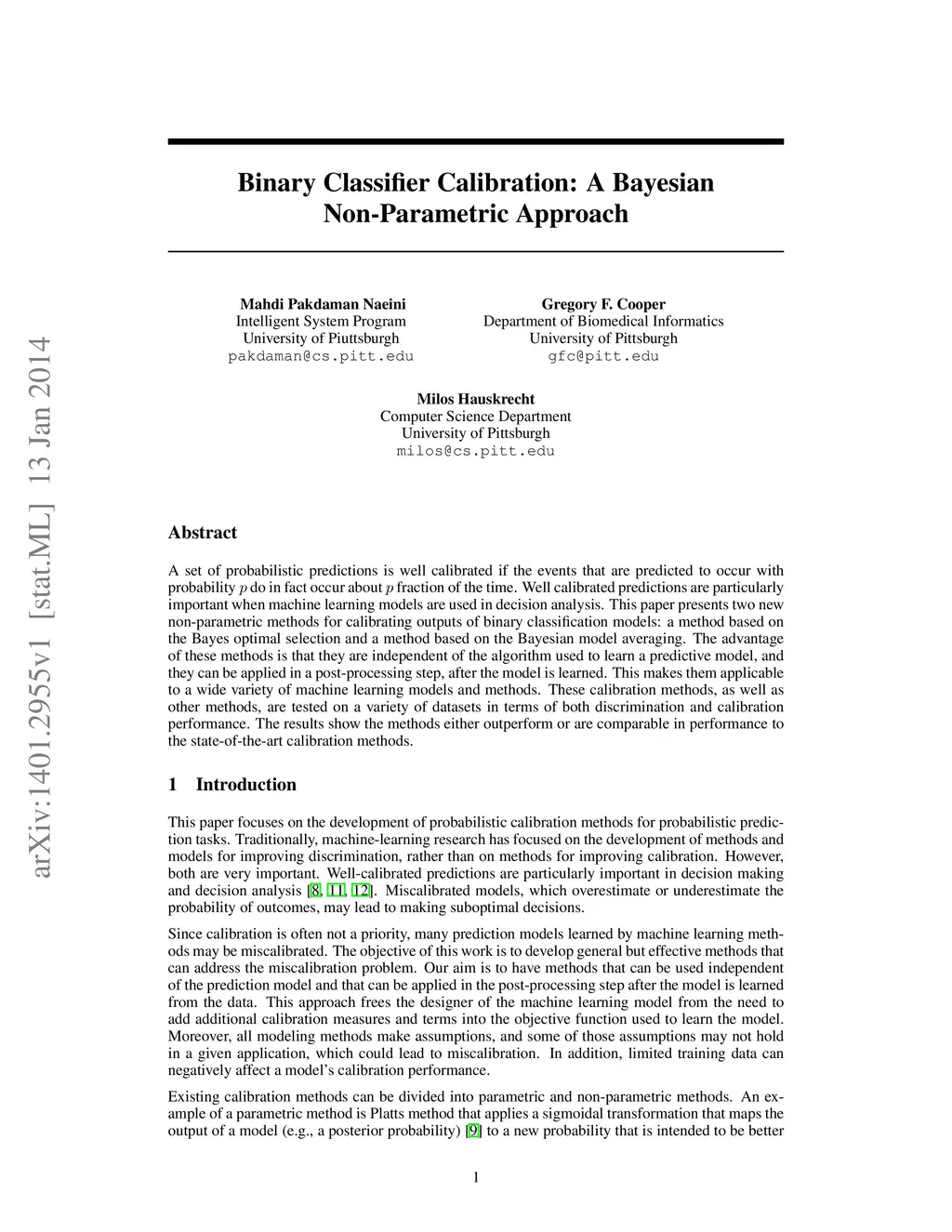 A set of probabilistic predictions is well calibrated if the events that are predicted to occur with probability p do in fact occur about p fraction of the time. Well calibrated predictions are particularly important when machine learning models are used in decision analysis. This paper presents two new non-parametric methods for calibrating outputs of binary classification models: a method based on the Bayes optimal selection and a method based on the Bayesian model averaging. The advantage of these methods is that they are independent of the algorithm used to learn a predictive model, and they can be applied in a post-processing step, after the model is learned. This makes them applicable to a wide variety of machine learning models and methods. These calibration methods, as well as other methods, are tested on a variety of datasets in terms of both discrimination and calibration performance. The results show the methods either outperform or are comparable in performance to the state-of-the-art calibration methods.