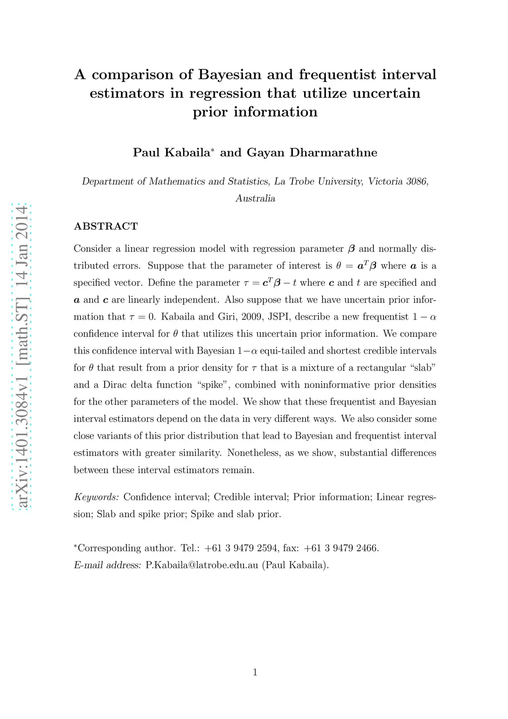 Consider a linear regression model with regression parameter beta and normally distributed errors. Suppose that the parameter of interest is theta = a^T beta where a is a specified vector. Define the parameter tau = c^T beta - t where c and t are specified and a and c are linearly independent. Also suppose that we have uncertain prior information that tau = 0. Kabaila and Giri, 2009, JSPI, describe a new frequentist 1-alpha confidence interval for theta that utilizes this uncertain prior information. We compare this confidence interval with Bayesian 1-alpha equi-tailed and shortest credible intervals for theta that result from a prior density for tau that is a mixture of a rectangular "slab" and a Dirac delta function "spike", combined with noninformative prior densities for the other parameters of the model. We show that these frequentist and Bayesian interval estimators depend on the data in very different ways. We also consider some close variants of this prior distribution that lead to Bayesian and frequentist interval estimators with greater similarity. Nonetheless, as we show, substantial differences between these interval estimators remain.