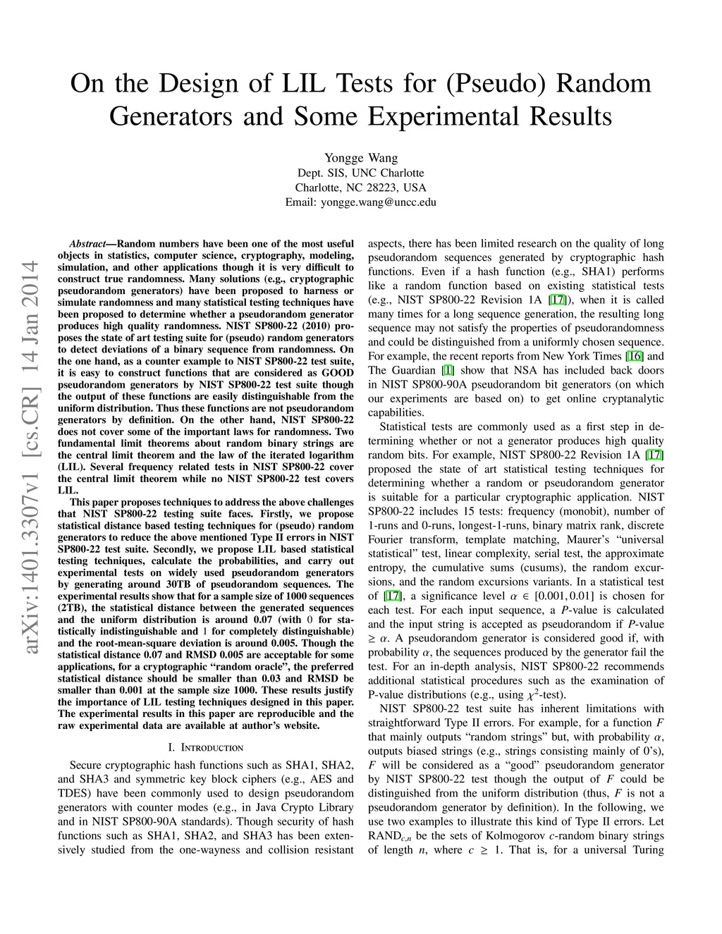 NIST SP800-22 (2010) proposes the state of art testing suite for (pseudo) random generators to detect deviations of a binary sequence from randomness. On the one hand, as a counter example to NIST SP800-22 test suite, it is easy to construct functions that are considered as GOOD pseudorandom generators by NIST SP800-22 test suite though the output of these functions are easily distinguishable from the uniform distribution. Thus these functions are not pseudorandom generators by definition. On the other hand, NIST SP800-22 does not cover some of the important laws for randomness. Two fundamental limit theorems about random binary strings are the central limit theorem and the law of the iterated logarithm (LIL). Several frequency related tests in NIST SP800-22 cover the central limit theorem while no NIST SP800-22 test covers LIL. This paper proposes techniques to address the above challenges that NIST SP800-22 testing suite faces. Firstly, we propose statistical distance based testing techniques for (pseudo) random generators to reduce the above mentioned Type II errors in NIST SP800-22 test suite. Secondly, we propose LIL based statistical testing techniques, calculate the probabilities, and carry out experimental tests on widely used pseudorandom generators by generating around 30TB of pseudorandom sequences. The experimental results show that for a sample size of 1000 sequences (2TB), the statistical distance between the generated sequences and the uniform distribution is around 0.07 (with for statistically indistinguishable and for completely distinguishable) and the root-mean-square deviation is around 0.005.