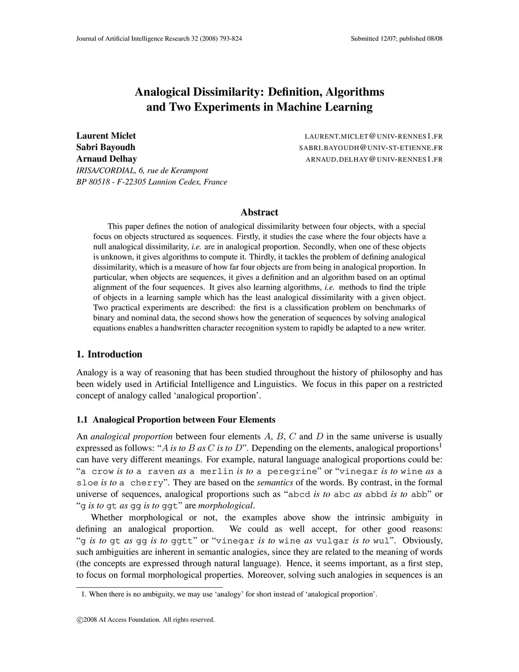 Analogical Dissimilarity: Definition, Algorithms and Two Experiments in