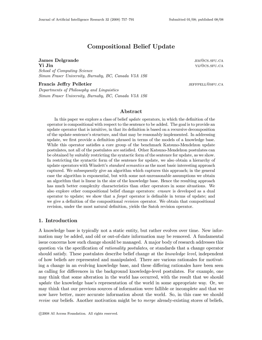 In this paper we explore a class of belief update operators, in which the definition of the operator is compositional with respect to the sentence to be added. The goal is to provide an update operator that is intuitive, in that its definition is based on a recursive decomposition of the update sentences structure, and that may be reasonably implemented. In addressing update, we first provide a definition phrased in terms of the models of a knowledge base. While this operator satisfies a core group of the benchmark Katsuno-Mendelzon update postulates, not all of the postulates are satisfied. Other Katsuno-Mendelzon postulates can be obtained by suitably restricting the syntactic form of the sentence for update, as we show. In restricting the syntactic form of the sentence for update, we also obtain a hierarchy of update operators with Winsletts standard semantics as the most basic interesting approach captured. We subsequently give an algorithm which captures this approach; in the general case the algorithm is exponential, but with some not-unreasonable assumptions we obtain an algorithm that is linear in the size of the knowledge base. Hence the resulting approach has much better complexity characteristics than other operators in some situations. We also explore other compositional belief change operators: erasure is developed as a dual operator to update; we show that a forget operator is definable in terms of update; and we give a definition of the compositional revision operator. We obtain that compositional revision, under the most natural definition, yields the Satoh revision operator.