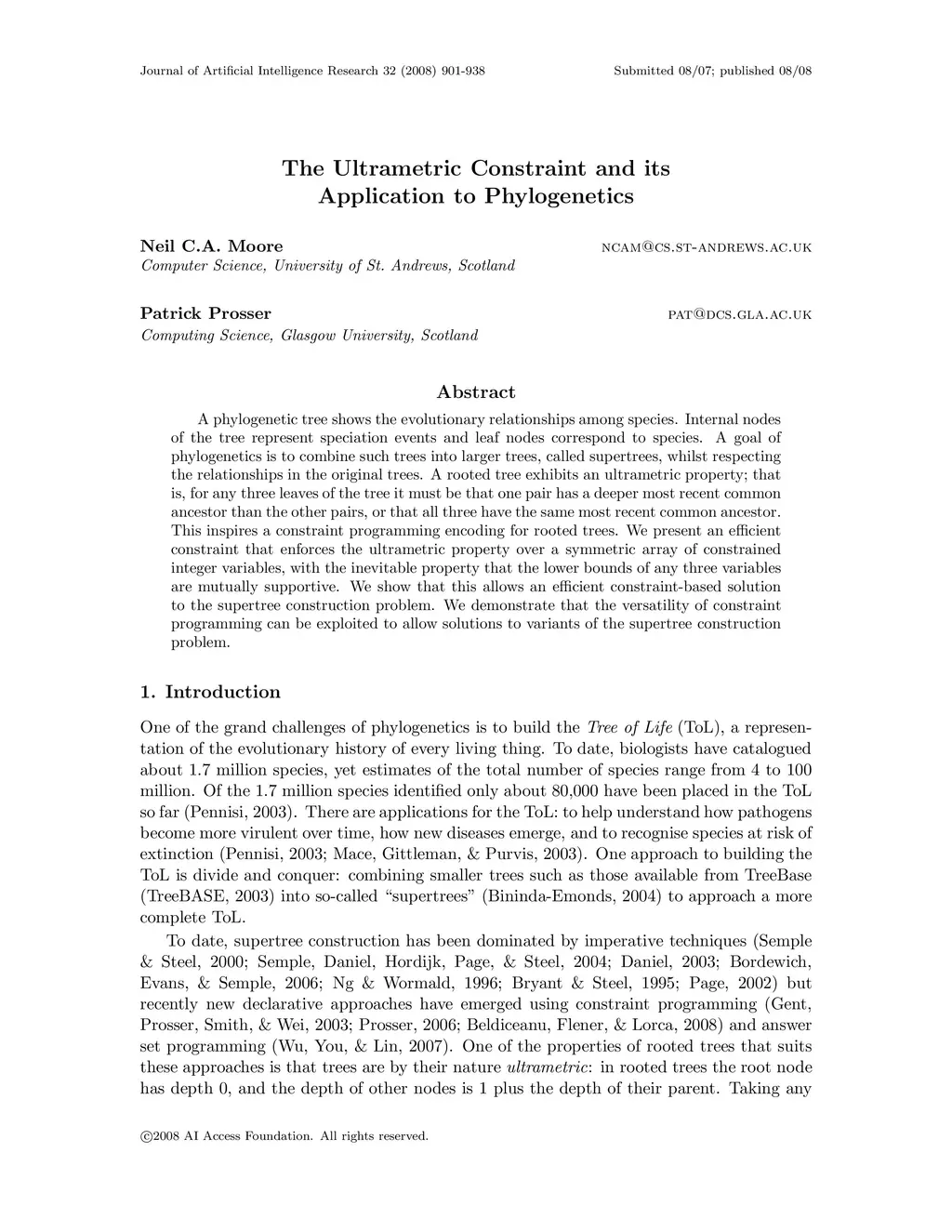 A phylogenetic tree shows the evolutionary relationships among species. Internal nodes of the tree represent speciation events and leaf nodes correspond to species. A goal of phylogenetics is to combine such trees into larger trees, called supertrees, whilst respecting the relationships in the original trees. A rooted tree exhibits an ultrametric property; that is, for any three leaves of the tree it must be that one pair has a deeper most recent common ancestor than the other pairs, or that all three have the same most recent common ancestor. This inspires a constraint programming encoding for rooted trees. We present an efficient constraint that enforces the ultrametric property over a symmetric array of constrained integer variables, with the inevitable property that the lower bounds of any three variables are mutually supportive. We show that this allows an efficient constraint-based solution to the supertree construction problem. We demonstrate that the versatility of constraint programming can be exploited to allow solutions to variants of the supertree construction problem.
