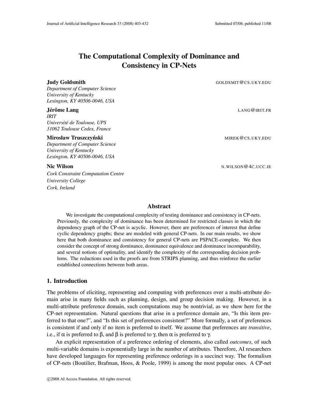 The Computational Complexity of Dominance and Consistency in CP-Nets