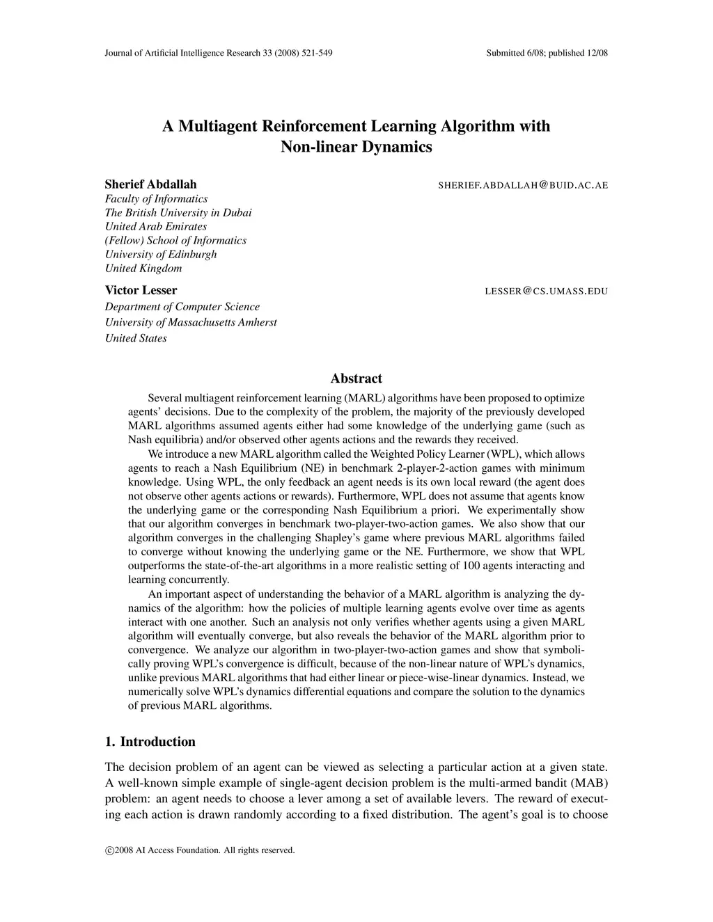 Several multiagent reinforcement learning (MARL) algorithms have been proposed to optimize agents decisions. Due to the complexity of the problem, the majority of the previously developed MARL algorithms assumed agents either had some knowledge of the underlying game (such as Nash equilibria) and/or observed other agents actions and the rewards they received. We introduce a new MARL algorithm called the Weighted Policy Learner (WPL), which allows agents to reach a Nash Equilibrium (NE) in benchmark 2-player-2-action games with minimum knowledge. Using WPL, the only feedback an agent needs is its own local reward (the agent does not observe other agents actions or rewards). Furthermore, WPL does not assume that agents know the underlying game or the corresponding Nash Equilibrium a priori. We experimentally show that our algorithm converges in benchmark two-player-two-action games. We also show that our algorithm converges in the challenging Shapleys game where previous MARL algorithms failed to converge without knowing the underlying game or the NE. Furthermore, we show that WPL outperforms the state-of-the-art algorithms in a more realistic setting of 100 agents interacting and learning concurrently. An important aspect of understanding the behavior of a MARL algorithm is analyzing the dynamics of the algorithm: how the policies of multiple learning agents evolve over time as agents interact with one another. Such an analysis not only verifies whether agents using a given MARL algorithm will eventually converge, but also reveals the behavior of the MARL algorithm prior to convergence. We analyze our algorithm in two-player-two-action games and show that symbolically proving WPLs convergence is difficult, because of the non-linear nature of WPLs dynamics, unlike previous MARL algorithms that had either linear or piece-wise-linear dynamics. Instead, we numerically solve WPLs dynamics differential equations and compare the solution to the dynamics of previous MARL algorithms.