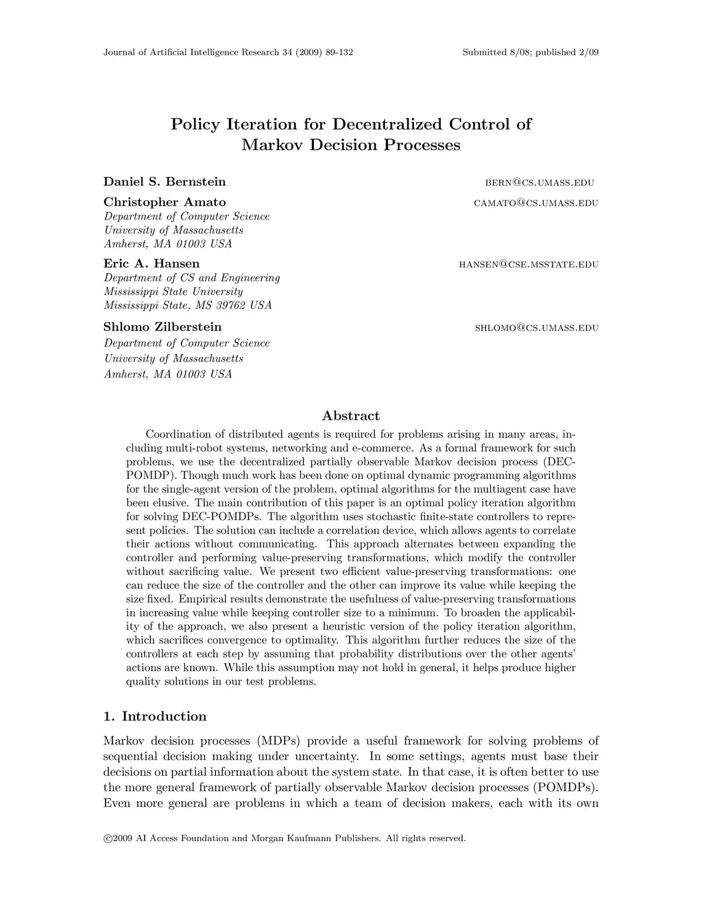 Coordination of distributed agents is required for problems arising in many areas, including multi-robot systems, networking and e-commerce. As a formal framework for such problems, we use the decentralized partially observable Markov decision process (DEC-POMDP). Though much work has been done on optimal dynamic programming algorithms for the single-agent version of the problem, optimal algorithms for the multiagent case have been elusive. The main contribution of this paper is an optimal policy iteration algorithm for solving DEC-POMDPs. The algorithm uses stochastic finite-state controllers to represent policies. The solution can include a correlation device, which allows agents to correlate their actions without communicating. This approach alternates between expanding the controller and performing value-preserving transformations, which modify the controller without sacrificing value. We present two efficient value-preserving transformations: one can reduce the size of the controller and the other can improve its value while keeping the size fixed. Empirical results demonstrate the usefulness of value-preserving transformations in increasing value while keeping controller size to a minimum. To broaden the applicability of the approach, we also present a heuristic version of the policy iteration algorithm, which sacrifices convergence to optimality. This algorithm further reduces the size of the controllers at each step by assuming that probability distributions over the other agents actions are known. While this assumption may not hold in general, it helps produce higher quality solutions in our test problems.