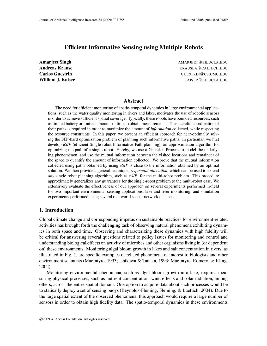 The need for efficient monitoring of spatio-temporal dynamics in large environmental applications, such as the water quality monitoring in rivers and lakes, motivates the use of robotic sensors in order to achieve sufficient spatial coverage. Typically, these robots have bounded resources, such as limited battery or limited amounts of time to obtain measurements. Thus, careful coordination of their paths is required in order to maximize the amount of information collected, while respecting the resource constraints. In this paper, we present an efficient approach for near-optimally solving the NP-hard optimization problem of planning such informative paths. In particular, we first develop eSIP (efficient Single-robot Informative Path planning), an approximation algorithm for optimizing the path of a single robot. Hereby, we use a Gaussian Process to model the underlying phenomenon, and use the mutual information between the visited locations and remainder of the space to quantify the amount of information collected. We prove that the mutual information collected using paths obtained by using eSIP is close to the information obtained by an optimal solution. We then provide a general technique, sequential allocation, which can be used to extend any single robot planning algorithm, such as eSIP, for the multi-robot problem. This procedure approximately generalizes any guarantees for the single-robot problem to the multi-robot case. We extensively evaluate the effectiveness of our approach on several experiments performed in-field for two important environmental sensing applications, lake and river monitoring, and simulation experiments performed using several real world sensor network data sets.