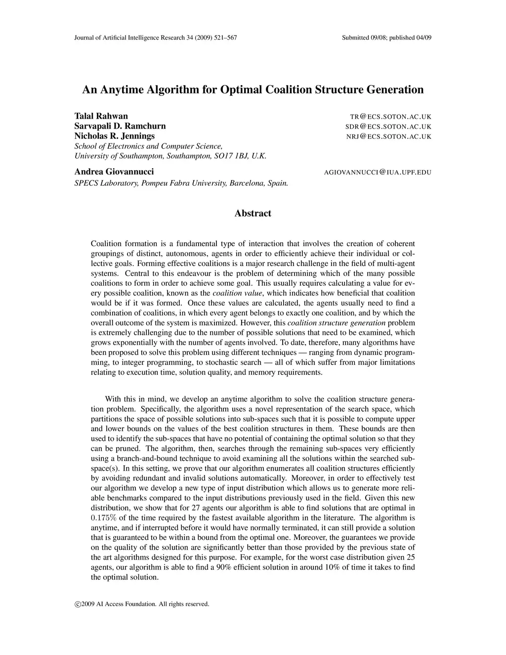 Coalition formation is a fundamental type of interaction that involves the creation of coherent groupings of distinct, autonomous, agents in order to efficiently achieve their individual or collective goals. Forming effective coalitions is a major research challenge in the field of multi-agent systems. Central to this endeavour is the problem of determining which of the many possible coalitions to form in order to achieve some goal. This usually requires calculating a value for every possible coalition, known as the coalition value, which indicates how beneficial that coalition would be if it was formed. Once these values are calculated, the agents usually need to find a combination of coalitions, in which every agent belongs to exactly one coalition, and by which the overall outcome of the system is maximized. However, this coalition structure generation problem is extremely challenging due to the number of possible solutions that need to be examined, which grows exponentially with the number of agents involved. To date, therefore, many algorithms have been proposed to solve this problem using different techniques ranging from dynamic programming, to integer programming, to stochastic search all of which suffer from major limitations relating to execution time, solution quality, and memory requirements. With this in mind, we develop an anytime algorithm to solve the coalition structure generation problem. Specifically, the algorithm uses a novel representation of the search space, which partitions the space of possible solutions into sub-spaces such that it is possible to compute upper and lower bounds on the values of the best coalition structures in them. These bounds are then used to identify the sub-spaces that have no potential of containing the optimal solution so that they can be pruned. The algorithm, then, searches through the remaining sub-spaces very efficiently using a branch-and-bound technique to avoid examining all the solutions within the searched subspace(s). In this setting, we prove that our algorithm enumerates all coalition structures efficiently by avoiding redundant and invalid solutions automatically. Moreover, in order to effectively test our algorithm we develop a new type of input distribution which allows us to generate more reliable benchmarks compared to the input distributions previously used in the field. Given this new distribution, we show that for 27 agents our algorithm is able to find solutions that are optimal in 0.175% of the time required by the fastest available algorithm in the literature. The algorithm is anytime, and if interrupted before it would have normally terminated, it can still provide a solution that is guaranteed to be within a bound from the optimal one. Moreover, the guarantees we provide on the quality of the solution are significantly better than those provided by the previous state of the art algorithms designed for this purpose. For example, for the worst case distribution given 25 agents, our algorithm is able to find a 90% efficient solution in around 10% of time it takes to find the optimal solution.