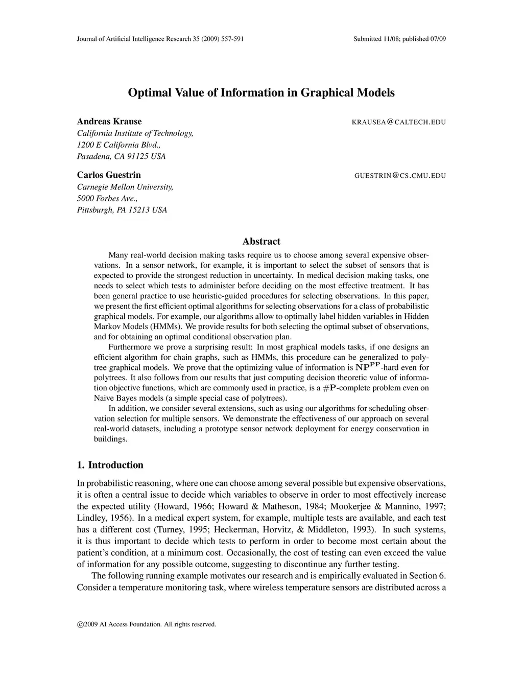 Many real-world decision making tasks require us to choose among several expensive observations. In a sensor network, for example, it is important to select the subset of sensors that is expected to provide the strongest reduction in uncertainty. In medical decision making tasks, one needs to select which tests to administer before deciding on the most effective treatment. It has been general practice to use heuristic-guided procedures for selecting observations. In this paper, we present the first efficient optimal algorithms for selecting observations for a class of probabilistic graphical models. For example, our algorithms allow to optimally label hidden variables in Hidden Markov Models (HMMs). We provide results for both selecting the optimal subset of observations, and for obtaining an optimal conditional observation plan. Furthermore we prove a surprising result: In most graphical models tasks, if one designs an efficient algorithm for chain graphs, such as HMMs, this procedure can be generalized to polytree graphical models. We prove that the optimizing value of information is -hard even for polytrees. It also follows from our results that just computing decision theoretic value of information objective functions, which are commonly used in practice, is a #P-complete problem even on Naive Bayes models (a simple special case of polytrees). In addition, we consider several extensions, such as using our algorithms for scheduling observation selection for multiple sensors. We demonstrate the effectiveness of our approach on several real-world datasets, including a prototype sensor network deployment for energy conservation in buildings.