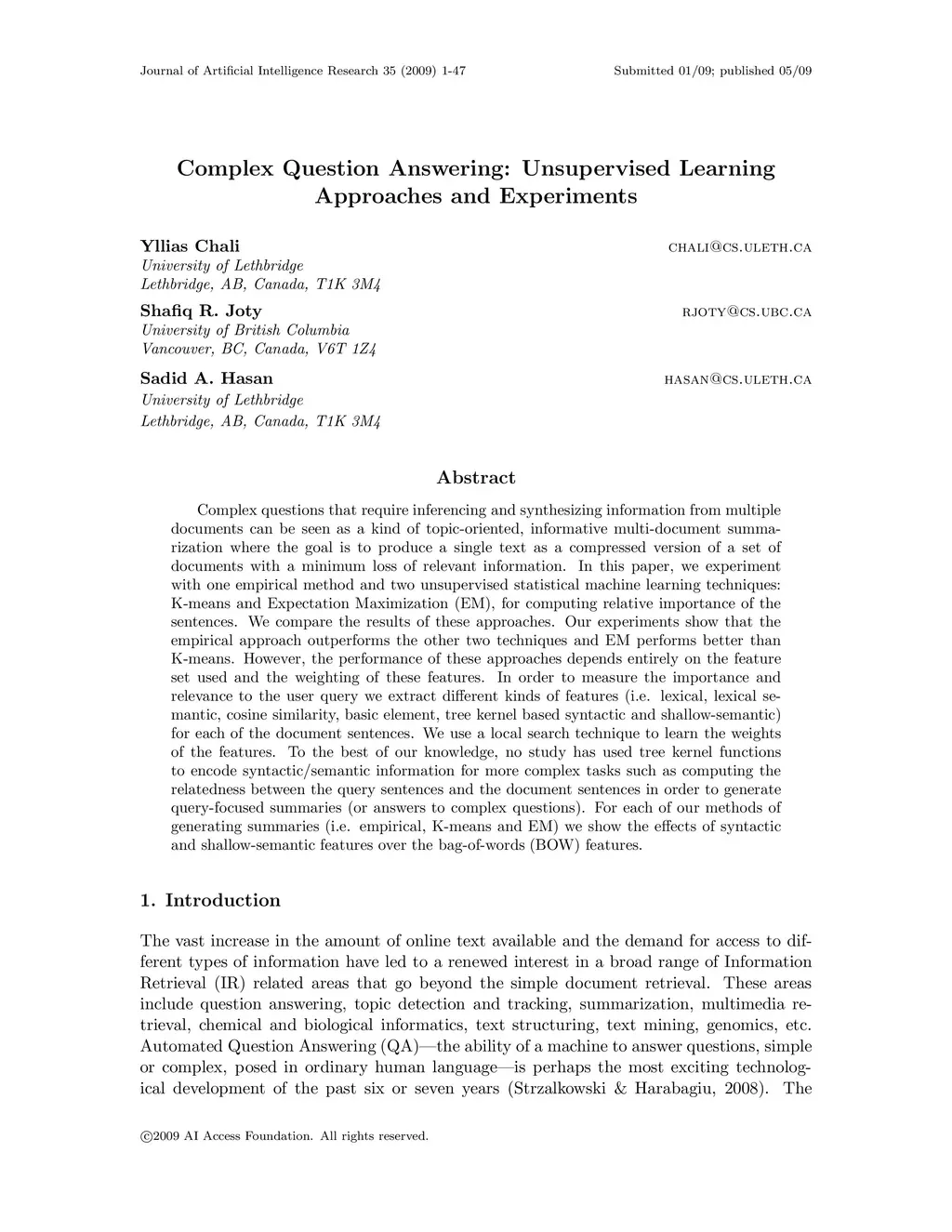 Complex questions that require inferencing and synthesizing information from multiple documents can be seen as a kind of topic-oriented, informative multi-document summarization where the goal is to produce a single text as a compressed version of a set of documents with a minimum loss of relevant information. In this paper, we experiment with one empirical method and two unsupervised statistical machine learning techniques: K-means and Expectation Maximization (EM), for computing relative importance of the sentences. We compare the results of these approaches. Our experiments show that the empirical approach outperforms the other two techniques and EM performs better than K-means. However, the performance of these approaches depends entirely on the feature set used and the weighting of these features. In order to measure the importance and relevance to the user query we extract different kinds of features (i.e. lexical, lexical semantic, cosine similarity, basic element, tree kernel based syntactic and shallow-semantic) for each of the document sentences. We use a local search technique to learn the weights of the features. To the best of our knowledge, no study has used tree kernel functions to encode syntactic/semantic information for more complex tasks such as computing the relatedness between the query sentences and the document sentences in order to generate query-focused summaries (or answers to complex questions). For each of our methods of generating summaries (i.e. empirical, K-means and EM) we show the effects of syntactic and shallow-semantic features over the bag-of-words (BOW) features.