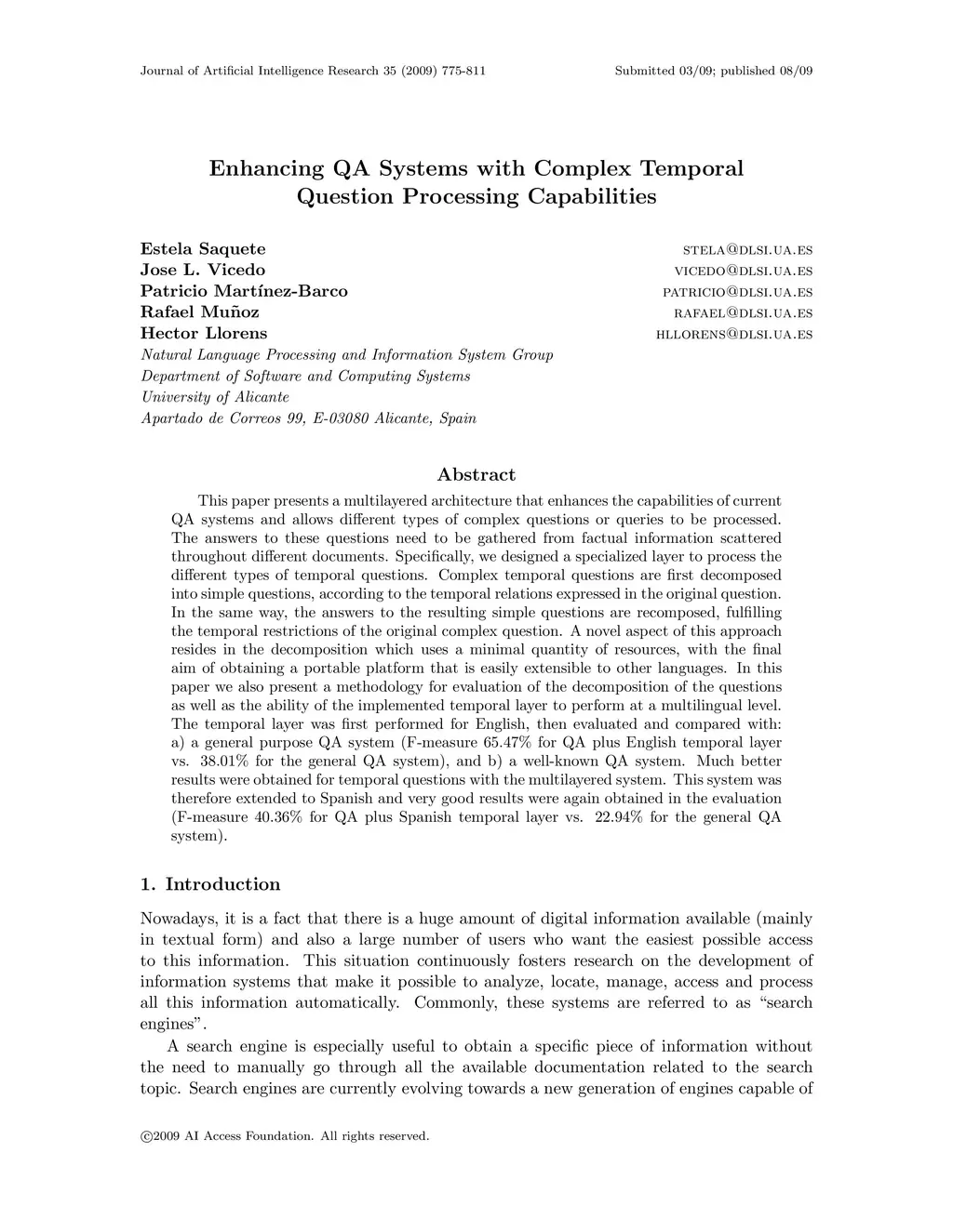 This paper presents a multilayered architecture that enhances the capabilities of current QA systems and allows different types of complex questions or queries to be processed. The answers to these questions need to be gathered from factual information scattered throughout different documents. Specifically, we designed a specialized layer to process the different types of temporal questions. Complex temporal questions are first decomposed into simple questions, according to the temporal relations expressed in the original question. In the same way, the answers to the resulting simple questions are recomposed, fulfilling the temporal restrictions of the original complex question. A novel aspect of this approach resides in the decomposition which uses a minimal quantity of resources, with the final aim of obtaining a portable platform that is easily extensible to other languages. In this paper we also present a methodology for evaluation of the decomposition of the questions as well as the ability of the implemented temporal layer to perform at a multilingual level. The temporal layer was first performed for English, then evaluated and compared with: a) a general purpose QA system (F-measure 65.47% for QA plus English temporal layer vs. 38.01% for the general QA system), and b) a well-known QA system. Much better results were obtained for temporal questions with the multilayered system. This system was therefore extended to Spanish and very good results were again obtained in the evaluation (F-measure 40.36% for QA plus Spanish temporal layer vs. 22.94% for the general QA system).