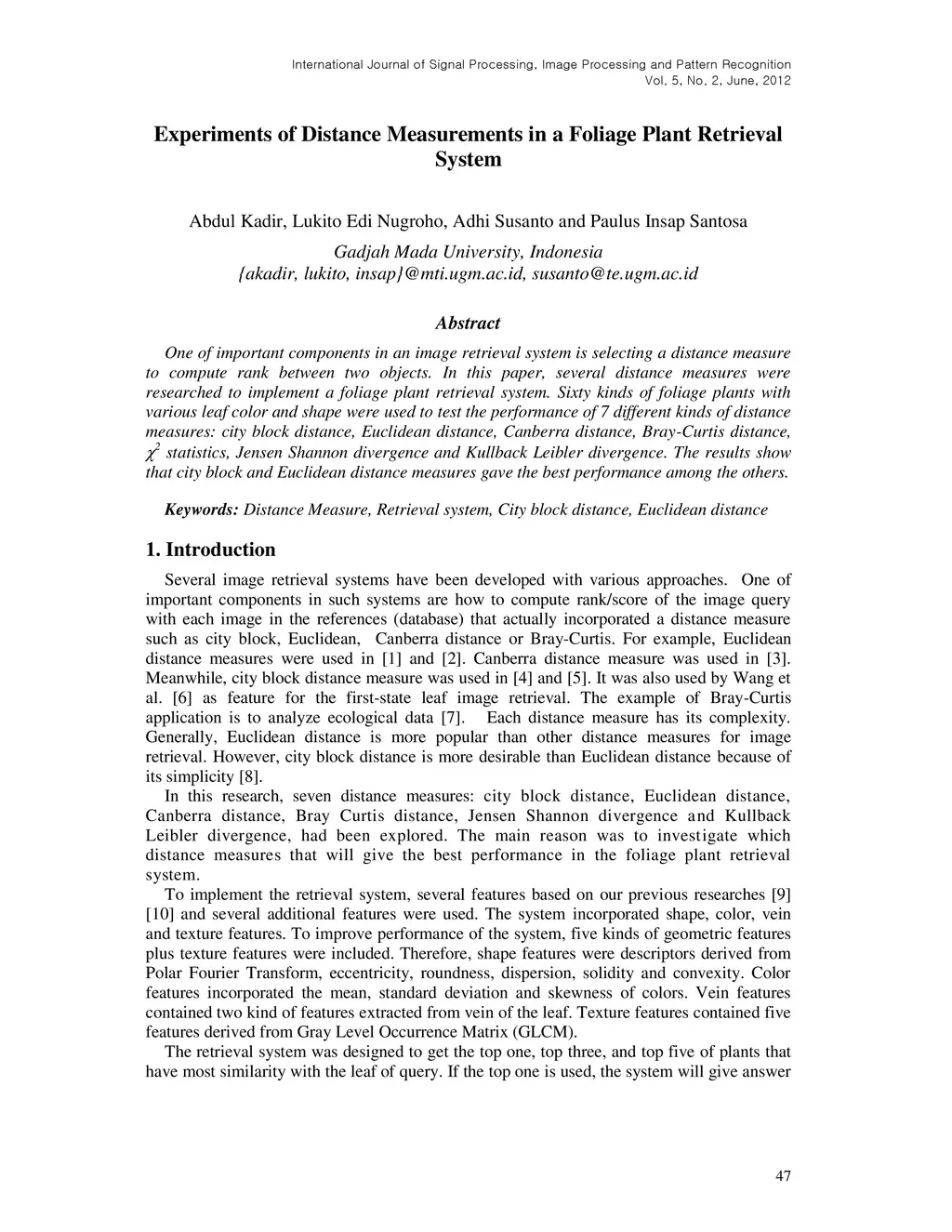Experiments of Distance Measurements in a Foliage Plant Retrieval System