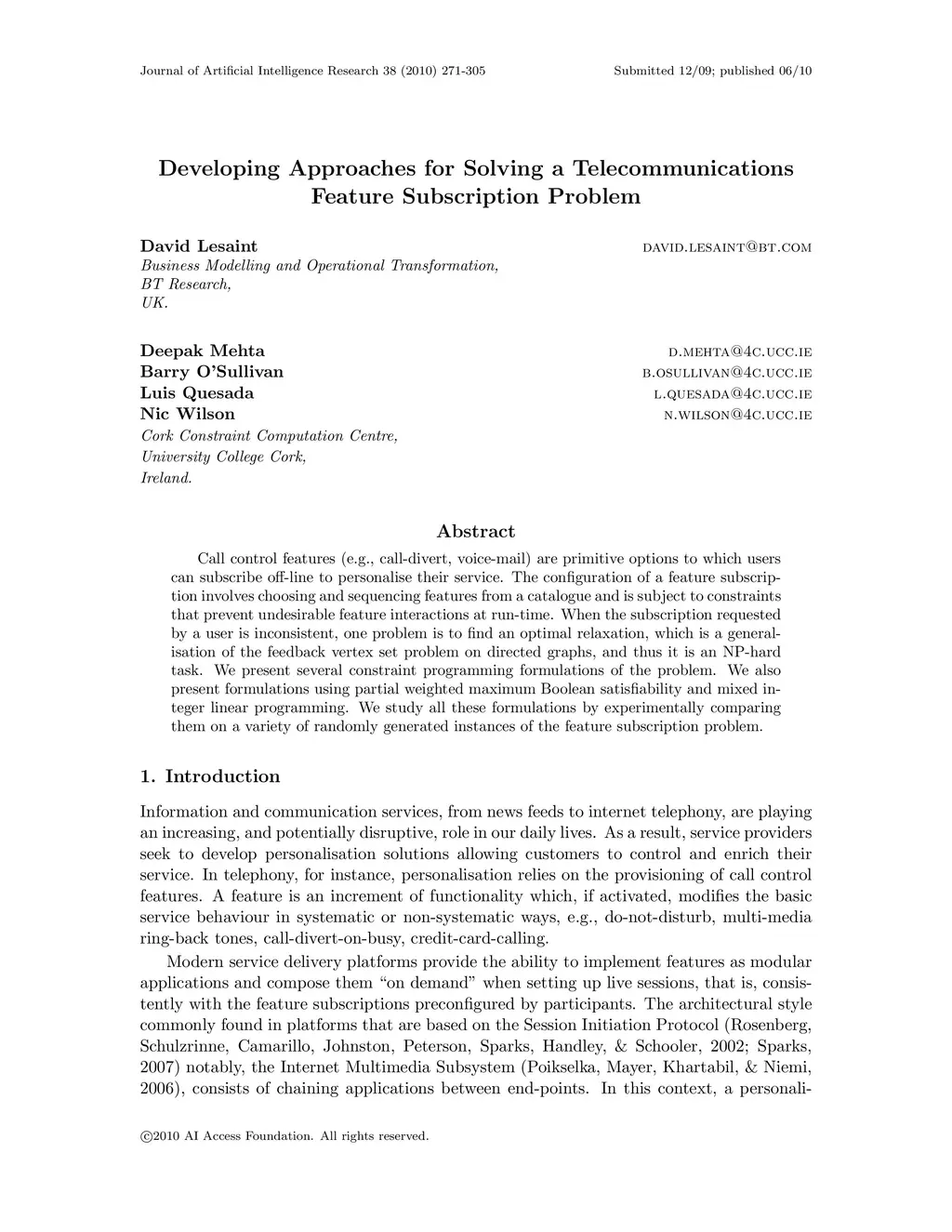 Call control features (e.g., call-divert, voice-mail) are primitive options to which users can subscribe off-line to personalise their service. The configuration of a feature subscription involves choosing and sequencing features from a catalogue and is subject to constraints that prevent undesirable feature interactions at run-time. When the subscription requested by a user is inconsistent, one problem is to find an optimal relaxation, which is a generalisation of the feedback vertex set problem on directed graphs, and thus it is an NP-hard task. We present several constraint programming formulations of the problem. We also present formulations using partial weighted maximum Boolean satisfiability and mixed integer linear programming. We study all these formulations by experimentally comparing them on a variety of randomly generated instances of the feature subscription problem.
