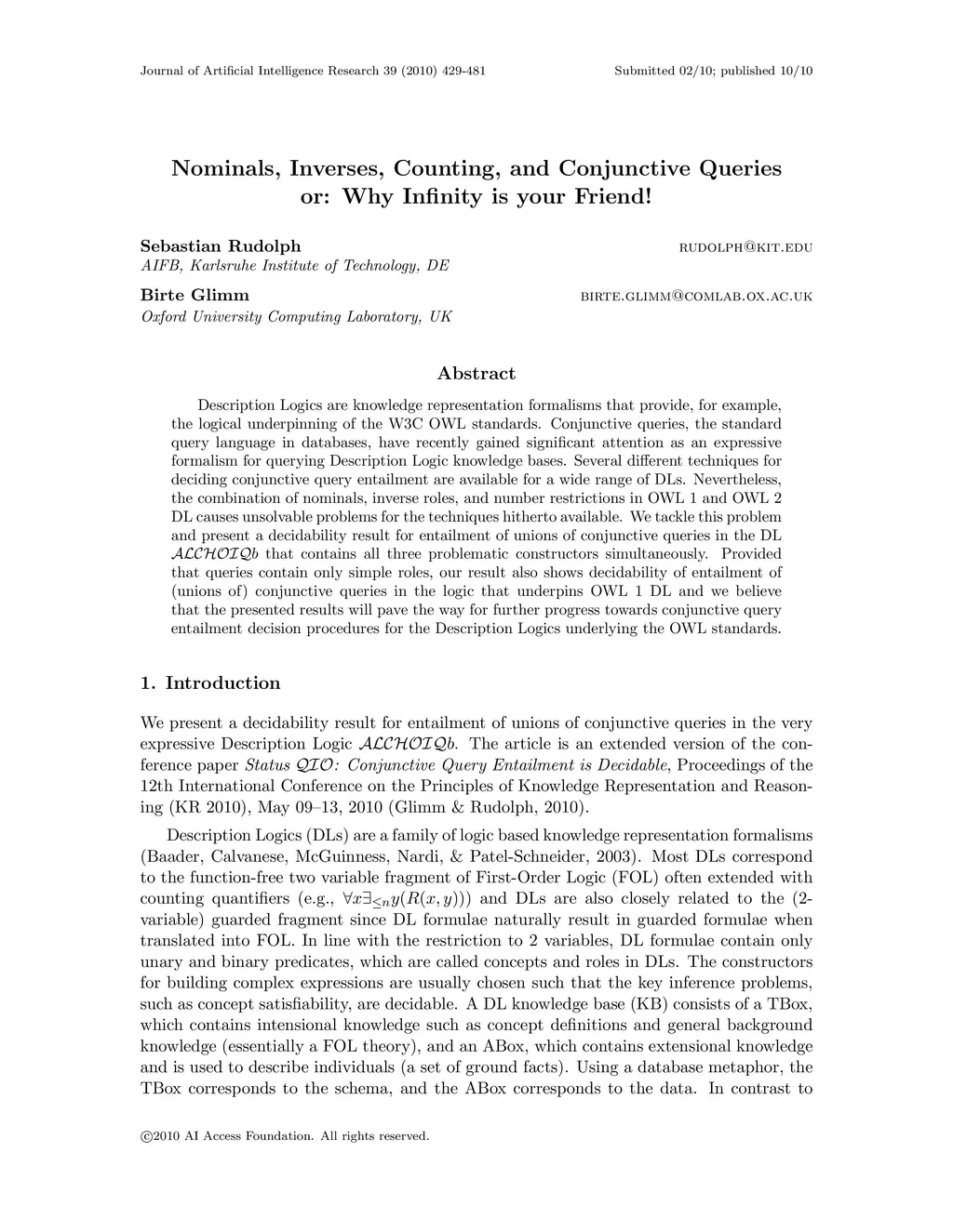 Nominals, Inverses, Counting, and Conjunctive Queries or: Why Infinity