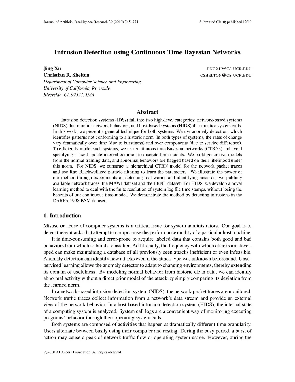 Intrusion detection systems (IDSs) fall into two high-level categories: network-based systems (NIDS) that monitor network behaviors, and host-based systems (HIDS) that monitor system calls. In this work, we present a general technique for both systems. We use anomaly detection, which identifies patterns not conforming to a historic norm. In both types of systems, the rates of change vary dramatically over time (due to burstiness) and over components (due to service difference). To efficiently model such systems, we use continuous time Bayesian networks (CTBNs) and avoid specifying a fixed update interval common to discrete-time models. We build generative models from the normal training data, and abnormal behaviors are flagged based on their likelihood under this norm. For NIDS, we construct a hierarchical CTBN model for the network packet traces and use Rao-Blackwellized particle filtering to learn the parameters. We illustrate the power of our method through experiments on detecting real worms and identifying hosts on two publicly available network traces, the MAWI dataset and the LBNL dataset. For HIDS, we develop a novel learning method to deal with the finite resolution of system log file time stamps, without losing the benefits of our continuous time model. We demonstrate the method by detecting intrusions in the DARPA 1998 BSM dataset.