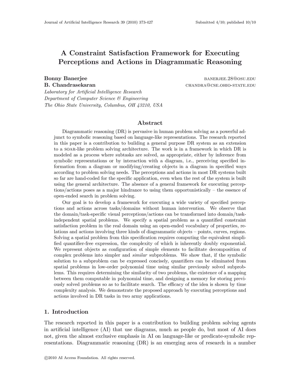 Diagrammatic reasoning (DR) is pervasive in human problem solving as a powerful adjunct to symbolic reasoning based on language-like representations. The research reported in this paper is a contribution to building a general purpose DR system as an extension to a SOAR-like problem solving architecture. The work is in a framework in which DR is modeled as a process where subtasks are solved, as appropriate, either by inference from symbolic representations or by interaction with a diagram, i.e., perceiving specified information from a diagram or modifying/creating objects in a diagram in specified ways according to problem solving needs. The perceptions and actions in most DR systems built so far are hand-coded for the specific application, even when the rest of the system is built using the general architecture. The absence of a general framework for executing perceptions/actions poses as a major hindrance to using them opportunistically -- the essence of open-ended search in problem solving. Our goal is to develop a framework for executing a wide variety of specified perceptions and actions across tasks/domains without human intervention. We observe that the domain/task-specific visual perceptions/actions can be transformed into domain/task-independent spatial problems. We specify a spatial problem as a quantified constraint satisfaction problem in the real domain using an open-ended vocabulary of properties, relations and actions involving three kinds of diagrammatic objects -- points, curves, regions. Solving a spatial problem from this specification requires computing the equivalent simplified quantifier-free expression, the complexity of which is inherently doubly exponential. We represent objects as configuration of simple elements to facilitate decomposition of complex problems into simpler and similar subproblems. We show that, if the symbolic solution to a subproblem can be expressed concisely, quantifiers can be eliminated from spatial problems in low-order polynomial time using similar previously solved subproblems. This requires determining the similarity of two problems, the existence of a mapping between them computable in polynomial time, and designing a memory for storing previously solved problems so as to facilitate search. The efficacy of the idea is shown by time complexity analysis. We demonstrate the proposed approach by executing perceptions and actions involved in DR tasks in two army applications.