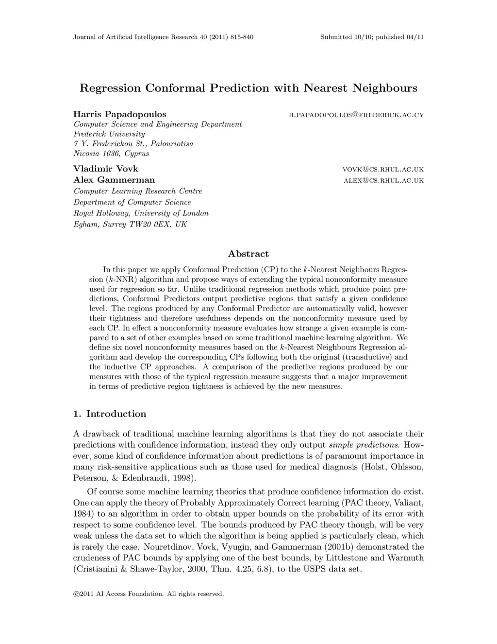 In this paper we apply Conformal Prediction (CP) to the k-Nearest Neighbours Regression (k-NNR) algorithm and propose ways of extending the typical nonconformity measure used for regression so far. Unlike traditional regression methods which produce point predictions, Conformal Predictors output predictive regions that satisfy a given confidence level. The regions produced by any Conformal Predictor are automatically valid, however their tightness and therefore usefulness depends on the nonconformity measure used by each CP. In effect a nonconformity measure evaluates how strange a given example is compared to a set of other examples based on some traditional machine learning algorithm. We define six novel nonconformity measures based on the k-Nearest Neighbours Regression algorithm and develop the corresponding CPs following both the original (transductive) and the inductive CP approaches. A comparison of the predictive regions produced by our measures with those of the typical regression measure suggests that a major improvement in terms of predictive region tightness is achieved by the new measures.
