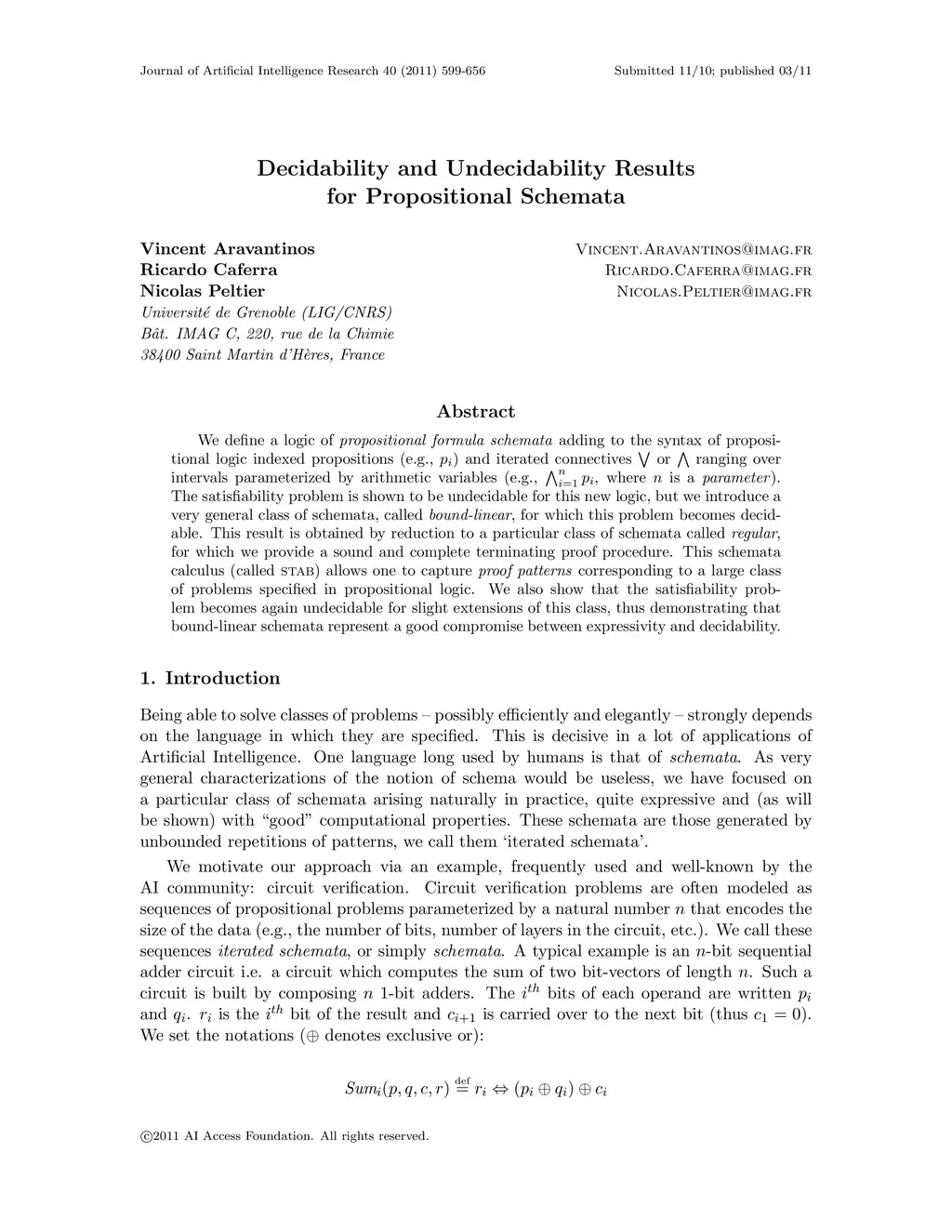 We define a logic of propositional formula schemata adding to the syntax of propositional logic indexed propositions and iterated connectives ranging over intervals parameterized by arithmetic variables. The satisfiability problem is shown to be undecidable for this new logic, but we introduce a very general class of schemata, called bound-linear, for which this problem becomes decidable. This result is obtained by reduction to a particular class of schemata called regular, for which we provide a sound and complete terminating proof procedure. This schemata calculus allows one to capture proof patterns corresponding to a large class of problems specified in propositional logic. We also show that the satisfiability problem becomes again undecidable for slight extensions of this class, thus demonstrating that bound-linear schemata represent a good compromise between expressivity and decidability.
