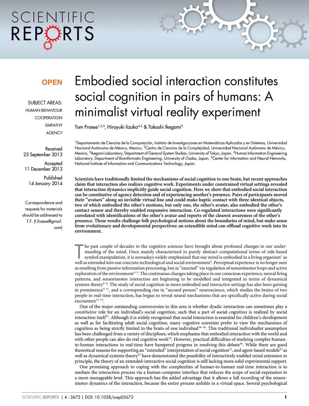 Embodied social interaction constitutes social cognition in pairs of