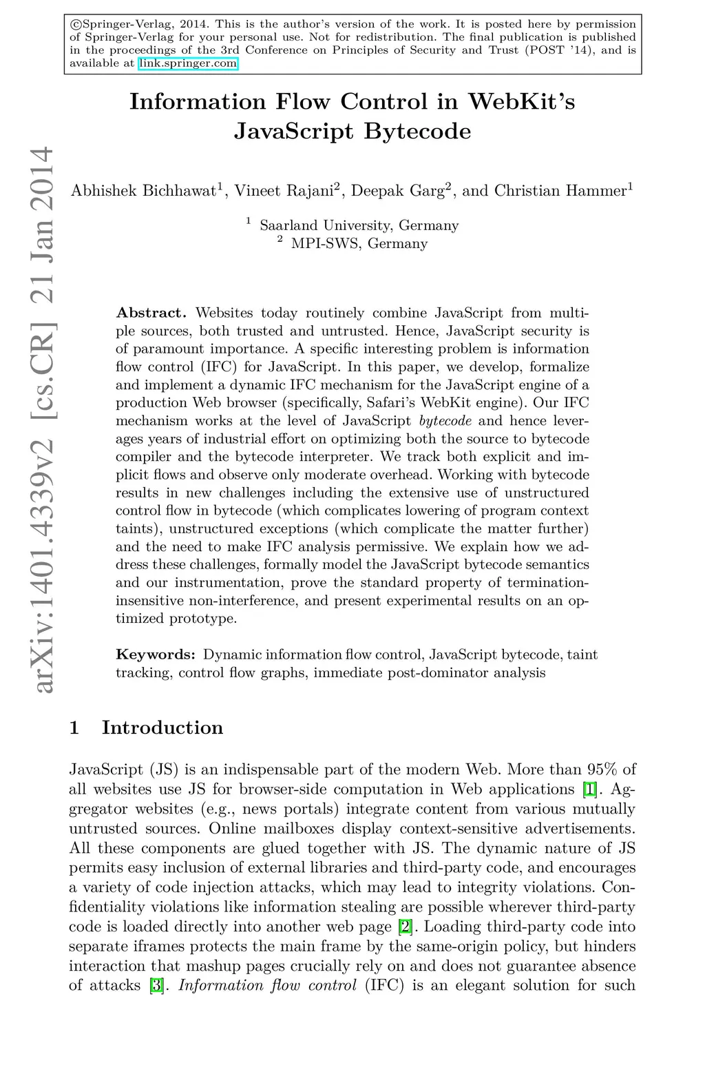 Websites today routinely combine JavaScript from multiple sources, both trusted and untrusted. Hence, JavaScript security is of paramount importance. A specific interesting problem is information flow control (IFC) for JavaScript. In this paper, we develop, formalize and implement a dynamic IFC mechanism for the JavaScript engine of a production Web browser (specifically, Safari's WebKit engine). Our IFC mechanism works at the level of JavaScript bytecode and hence leverages years of industrial effort on optimizing both the source to bytecode compiler and the bytecode interpreter. We track both explicit and implicit flows and observe only moderate overhead. Working with bytecode results in new challenges including the extensive use of unstructured control flow in bytecode (which complicates lowering of program context taints), unstructured exceptions (which complicate the matter further) and the need to make IFC analysis permissive. We explain how we address these challenges, formally model the JavaScript bytecode semantics and our instrumentation, prove the standard property of termination-insensitive non-interference, and present experimental results on an optimized prototype.