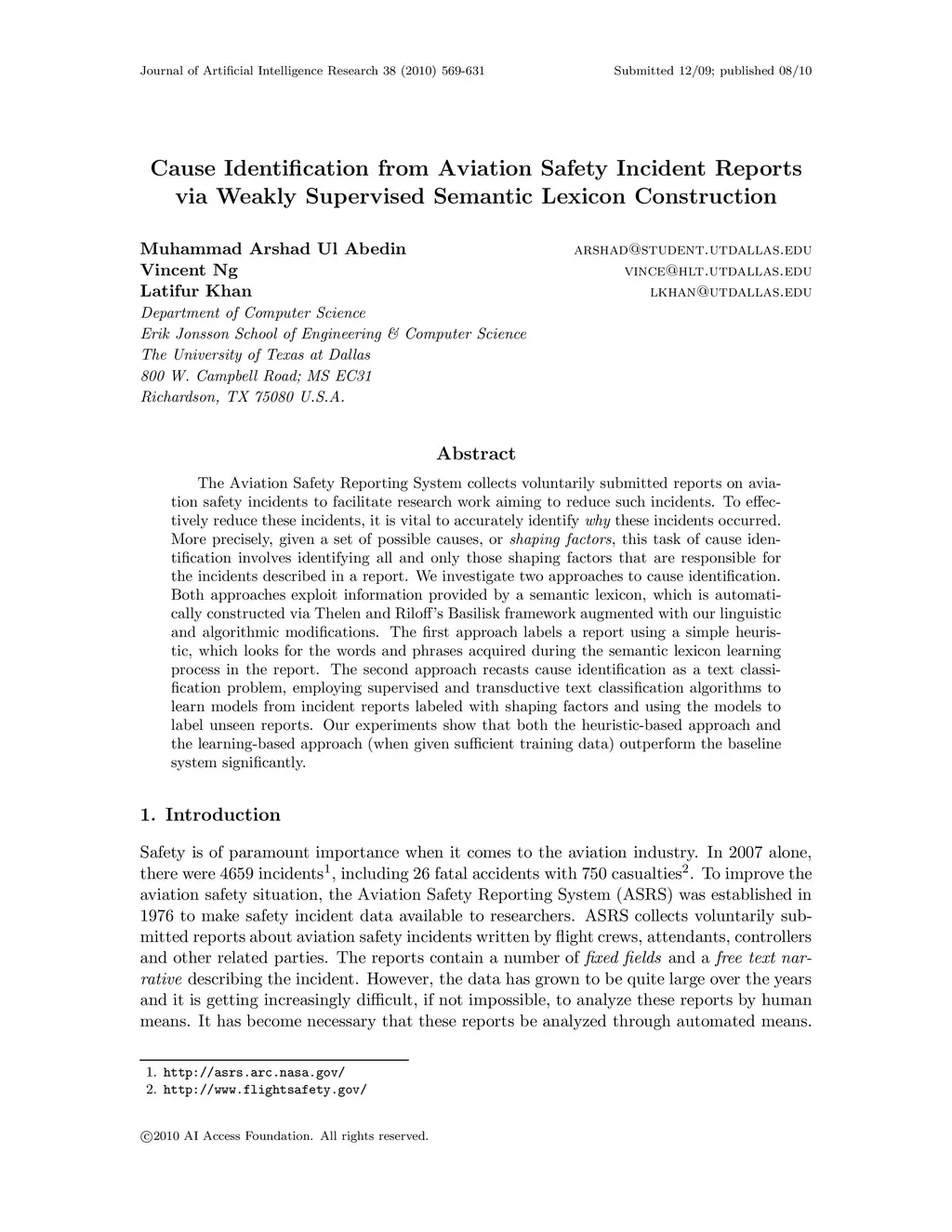 The Aviation Safety Reporting System collects voluntarily submitted reports on aviation safety incidents to facilitate research work aiming to reduce such incidents. To effectively reduce these incidents, it is vital to accurately identify why these incidents occurred. More precisely, given a set of possible causes, or shaping factors, this task of cause identification involves identifying all and only those shaping factors that are responsible for the incidents described in a report. We investigate two approaches to cause identification. Both approaches exploit information provided by a semantic lexicon, which is automatically constructed via Thelen and Riloffs Basilisk framework augmented with our linguistic and algorithmic modifications. The first approach labels a report using a simple heuristic, which looks for the words and phrases acquired during the semantic lexicon learning process in the report. The second approach recasts cause identification as a text classification problem, employing supervised and transductive text classification algorithms to learn models from incident reports labeled with shaping factors and using the models to label unseen reports. Our experiments show that both the heuristic-based approach and the learning-based approach (when given sufficient training data) outperform the baseline system significantly.