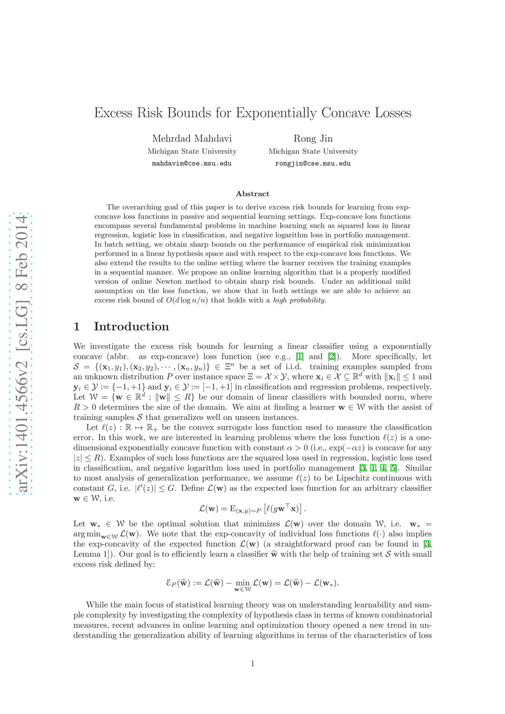 The overarching goal of this paper is to derive excess risk bounds for learning from exp-concave loss functions in passive and sequential learning settings. Exp-concave loss functions encompass several fundamental problems in machine learning such as squared loss in linear regression, logistic loss in classification, and negative logarithm loss in portfolio management. In batch setting, we obtain sharp bounds on the performance of empirical risk minimization performed in a linear hypothesis space and with respect to the exp-concave loss functions. We also extend the results to the online setting where the learner receives the training examples in a sequential manner. We propose an online learning algorithm that is a properly modified version of online Newton method to obtain sharp risk bounds. Under an additional mild assumption on the loss function, we show that in both settings we are able to achieve an excess risk bound of that holds with a high probability.