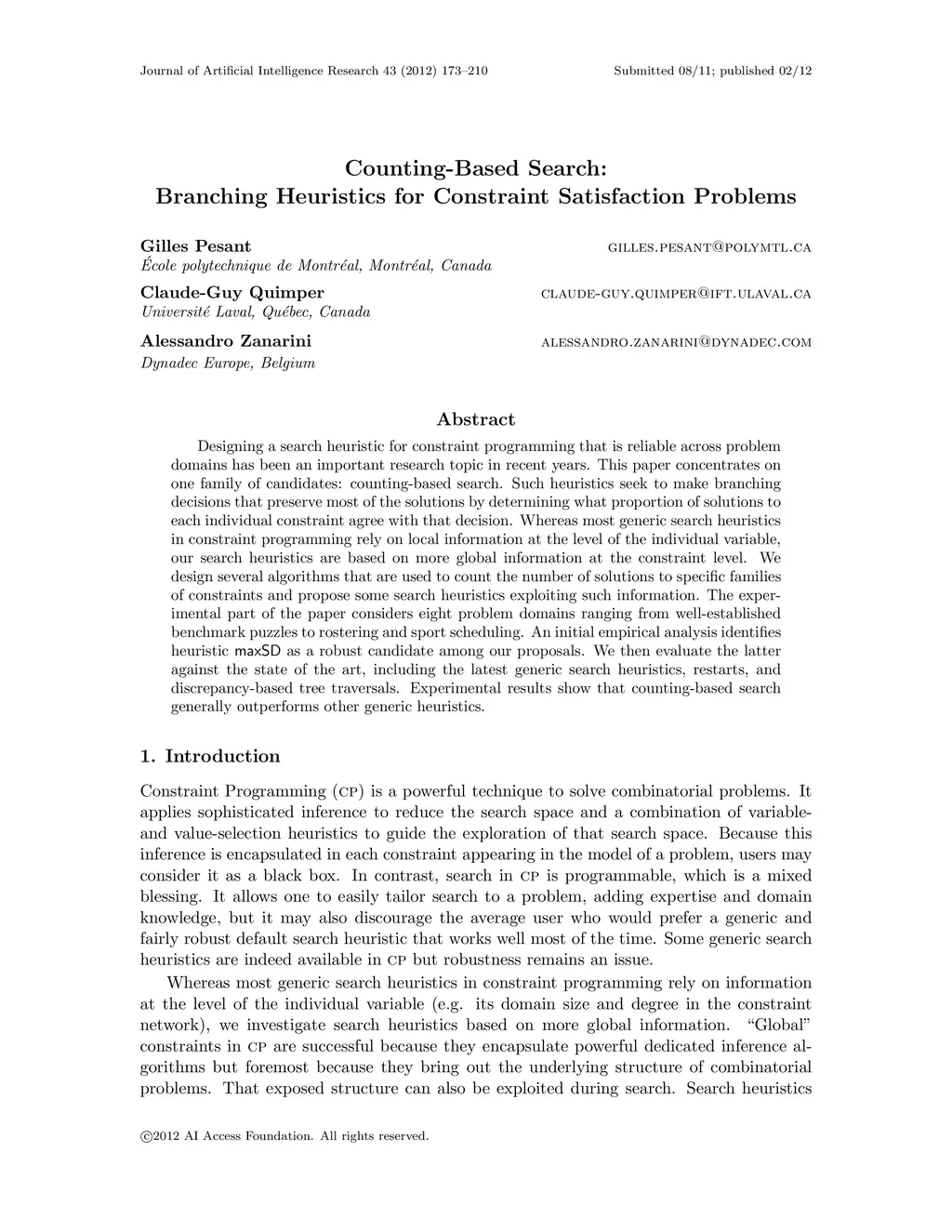 Designing a search heuristic for constraint programming that is reliable across problem domains has been an important research topic in recent years. This paper concentrates on one family of candidates: counting-based search. Such heuristics seek to make branching decisions that preserve most of the solutions by determining what proportion of solutions to each individual constraint agree with that decision. Whereas most generic search heuristics in constraint programming rely on local information at the level of the individual variable, our search heuristics are based on more global information at the constraint level. We design several algorithms that are used to count the number of solutions to specific families of constraints and propose some search heuristics exploiting such information. The experimental part of the paper considers eight problem domains ranging from well-established benchmark puzzles to rostering and sport scheduling. An initial empirical analysis identifies heuristic maxSD as a robust candidate among our proposals.eWe then evaluate the latter against the state of the art, including the latest generic search heuristics, restarts, and discrepancy-based tree traversals. Experimental results show that counting-based search generally outperforms other generic heuristics.