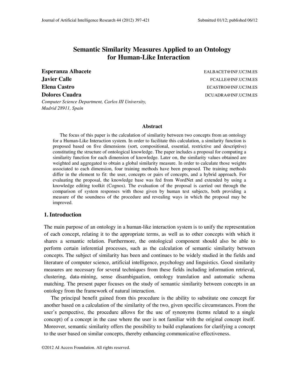 Semantic Similarity Measures Applied to an Ontology for Human-Like
