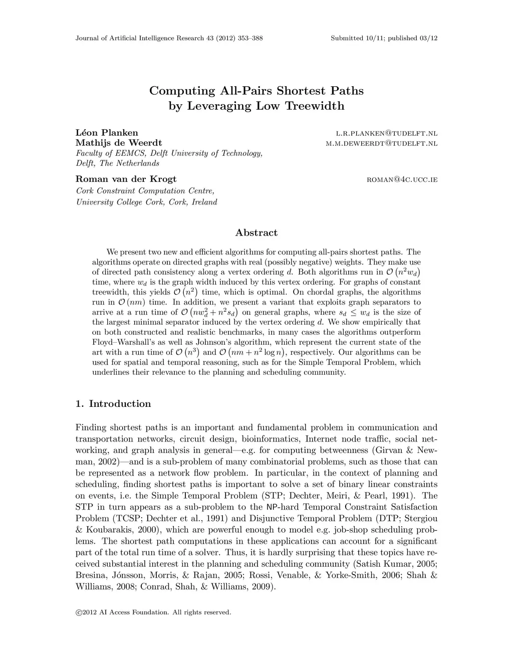 We present two new and efficient algorithms for computing all-pairs shortest paths. The algorithms operate on directed graphs with real (possibly negative) weights. They make use of directed path consistency along a vertex ordering d. Both algorithms run in O(n^2 w_d) time, where w_d is the graph width induced by this vertex ordering. For graphs of constant treewidth, this yields O(n^2) time, which is optimal. On chordal graphs, the algorithms run in O(nm) time. In addition, we present a variant that exploits graph separators to arrive at a run time of O(n w_d^2 + n^2 s_d) on general graphs, where s_d andlt= w_d is the size of the largest minimal separator induced by the vertex ordering d. We show empirically that on both constructed and realistic benchmarks, in many cases the algorithms outperform Floyd-Warshalls as well as Johnsons algorithm, which represent the current state of the art with a run time of O(n^3) and O(nm + n^2 log n), respectively. Our algorithms can be used for spatial and temporal reasoning, such as for the Simple Temporal Problem, which underlines their relevance to the planning and scheduling community.