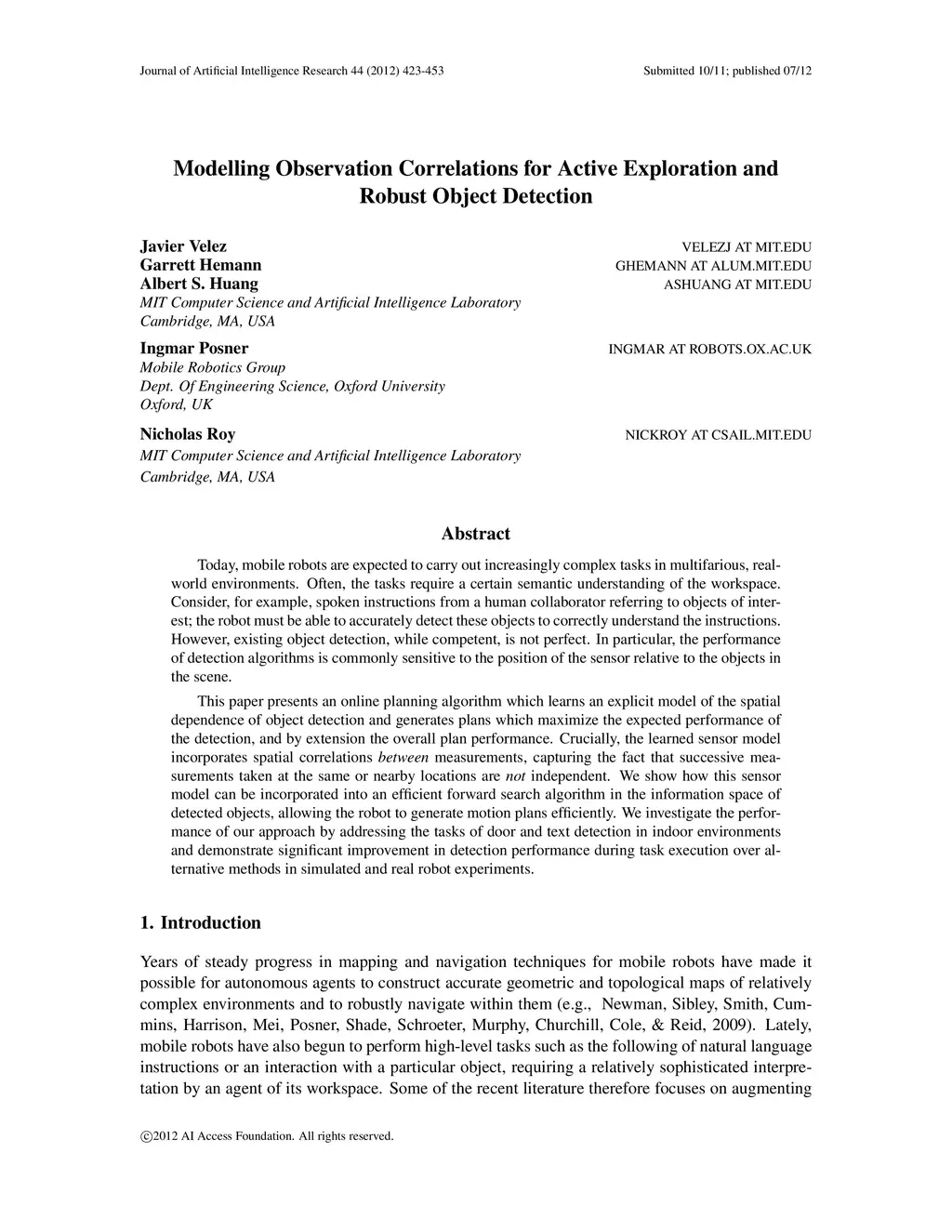 Today, mobile robots are expected to carry out increasingly complex tasks in multifarious, real-world environments. Often, the tasks require a certain semantic understanding of the workspace. Consider, for example, spoken instructions from a human collaborator referring to objects of interest; the robot must be able to accurately detect these objects to correctly understand the instructions. However, existing object detection, while competent, is not perfect. In particular, the performance of detection algorithms is commonly sensitive to the position of the sensor relative to the objects in the scene. This paper presents an online planning algorithm which learns an explicit model of the spatial dependence of object detection and generates plans which maximize the expected performance of the detection, and by extension the overall plan performance. Crucially, the learned sensor model incorporates spatial correlations between measurements, capturing the fact that successive measurements taken at the same or nearby locations are not independent. We show how this sensor model can be incorporated into an efficient forward search algorithm in the information space of detected objects, allowing the robot to generate motion plans efficiently. We investigate the performance of our approach by addressing the tasks of door and text detection in indoor environments and demonstrate significant improvement in detection performance during task execution over alternative methods in simulated and real robot experiments.