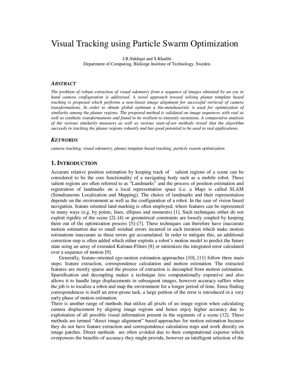 The problem of robust extraction of visual odometry from a sequence of images obtained by an eye in hand camera configuration is addressed. A novel approach toward solving planar template based tracking is proposed which performs a non-linear image alignment for successful retrieval of camera transformations. In order to obtain global optimum a bio-metaheuristic is used for optimization of similarity among the planar regions. The proposed method is validated on image sequences with real as well as synthetic transformations and found to be resilient to intensity variations. A comparative analysis of the various similarity measures as well as various state-of-art methods reveal that the algorithm succeeds in tracking the planar regions robustly and has good potential to be used in real applications.