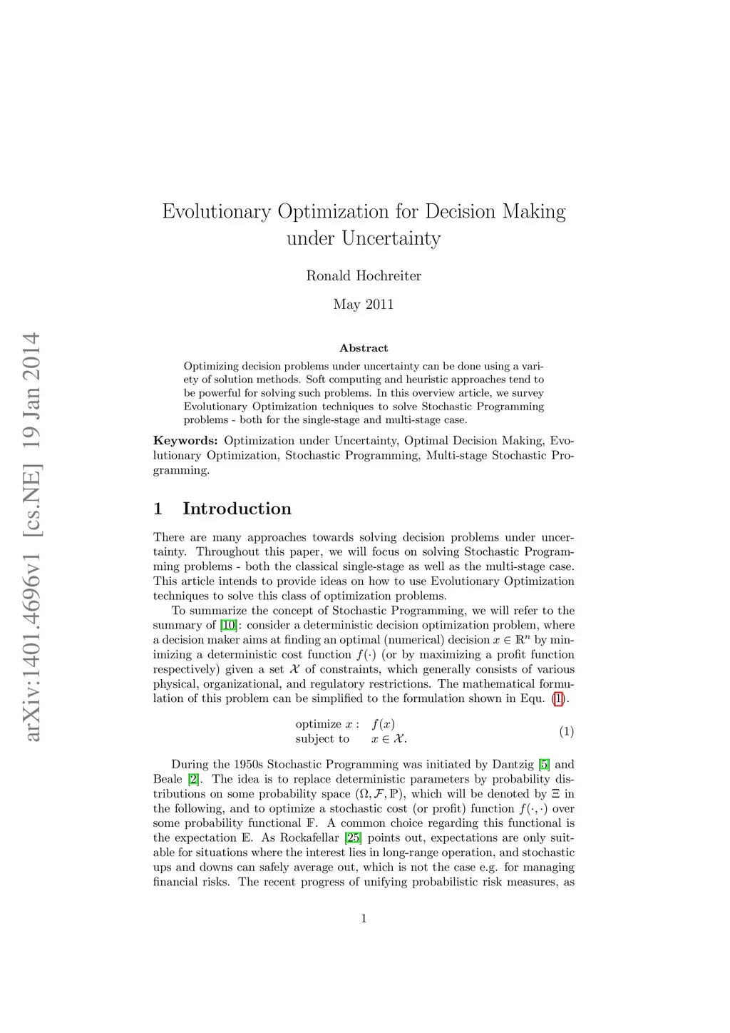 Optimizing decision problems under uncertainty can be done using a variety of solution methods. Soft computing and heuristic approaches tend to be powerful for solving such problems. In this overview article, we survey Evolutionary Optimization techniques to solve Stochastic Programming problems - both for the single-stage and multi-stage case.