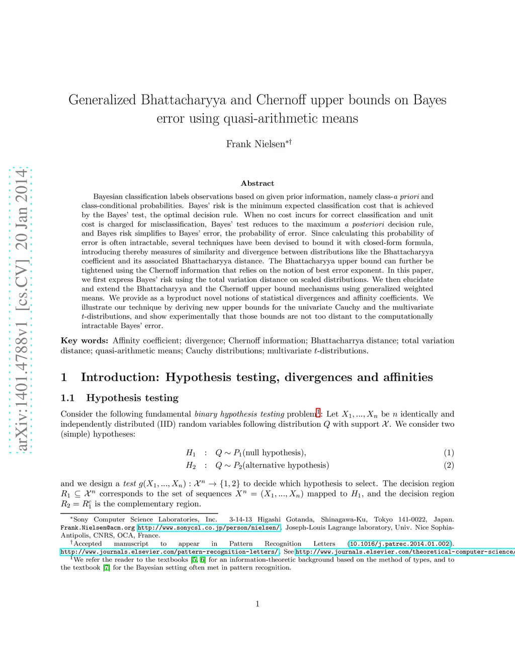 Bayesian classification labels observations based on given prior information, namely class-a priori and class-conditional probabilities. Bayes' risk is the minimum expected classification cost that is achieved by the Bayes' test, the optimal decision rule. When no cost incurs for correct classification and unit cost is charged for misclassification, Bayes' test reduces to the maximum a posteriori decision rule, and Bayes risk simplifies to Bayes' error, the probability of error. Since calculating this probability of error is often intractable, several techniques have been devised to bound it with closed-form formula, introducing thereby measures of similarity and divergence between distributions like the Bhattacharyya coefficient and its associated Bhattacharyya distance. The Bhattacharyya upper bound can further be tightened using the Chernoff information that relies on the notion of best error exponent. In this paper, we first express Bayes' risk using the total variation distance on scaled distributions. We then elucidate and extend the Bhattacharyya and the Chernoff upper bound mechanisms using generalized weighted means. We provide as a byproduct novel notions of statistical divergences and affinity coefficients. We illustrate our technique by deriving new upper bounds for the univariate Cauchy and the multivariate -distributions, and show experimentally that those bounds are not too distant to the computationally intractable Bayes' error.