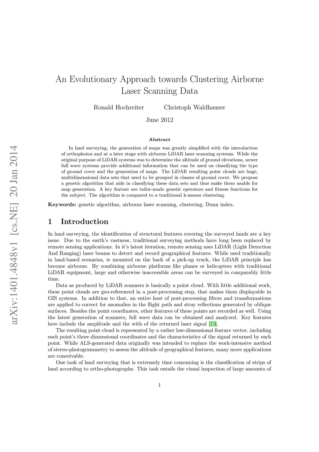 In land surveying, the generation of maps was greatly simplified with the introduction of orthophotos and at a later stage with airborne LiDAR laser scanning systems. While the original purpose of LiDAR systems was to determine the altitude of ground elevations, newer full wave systems provide additional information that can be used on classifying the type of ground cover and the generation of maps. The LiDAR resulting point clouds are huge, multidimensional data sets that need to be grouped in classes of ground cover. We propose a genetic algorithm that aids in classifying these data sets and thus make them usable for map generation. A key feature are tailor-made genetic operators and fitness functions for the subject. The algorithm is compared to a traditional k-means clustering.
