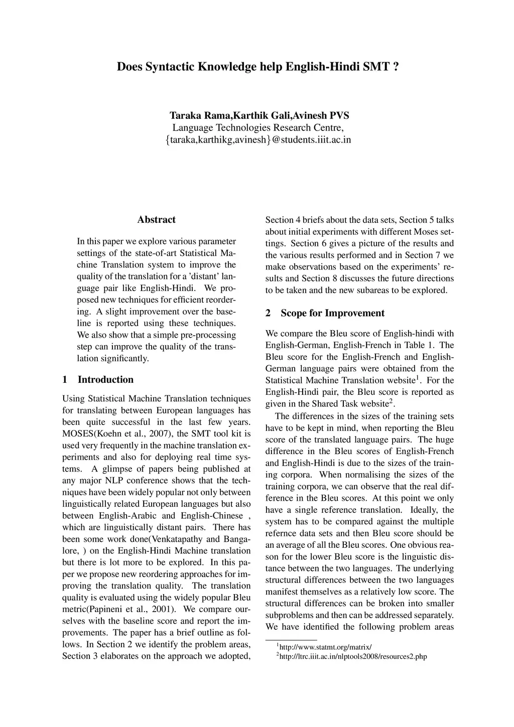 In this paper we explore various parameter settings of the state-of-art Statistical Machine Translation system to improve the quality of the translation for a `distant' language pair like English-Hindi. We proposed new techniques for efficient reordering. A slight improvement over the baseline is reported using these techniques. We also show that a simple pre-processing step can improve the quality of the translation significantly.