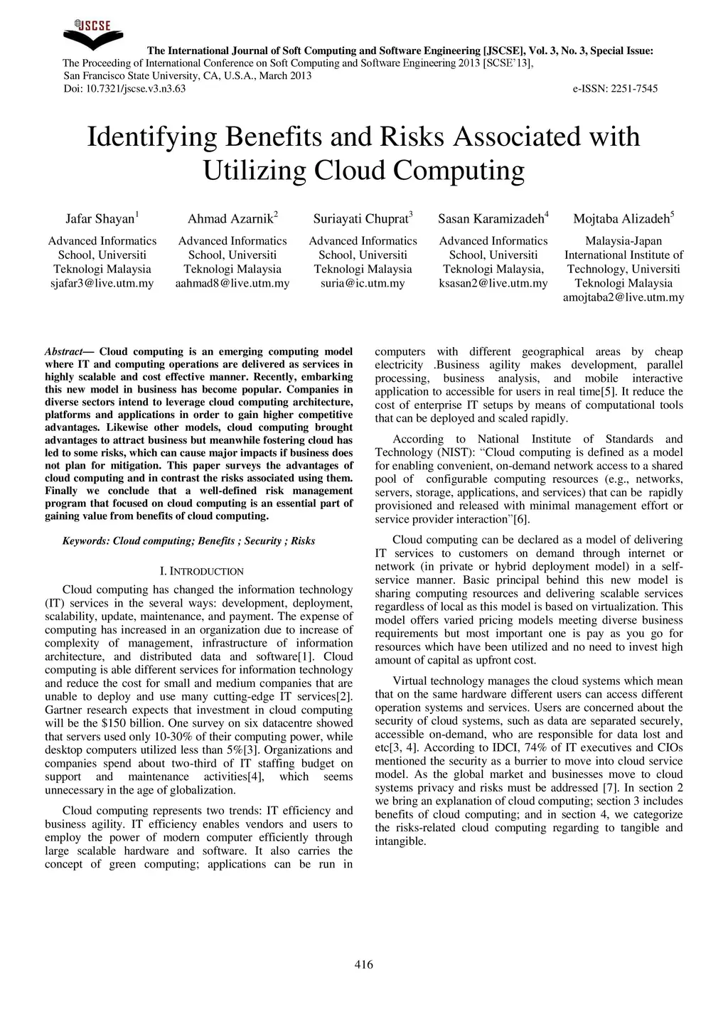 Identifying Benefits and risks associated with utilizing cloud computing